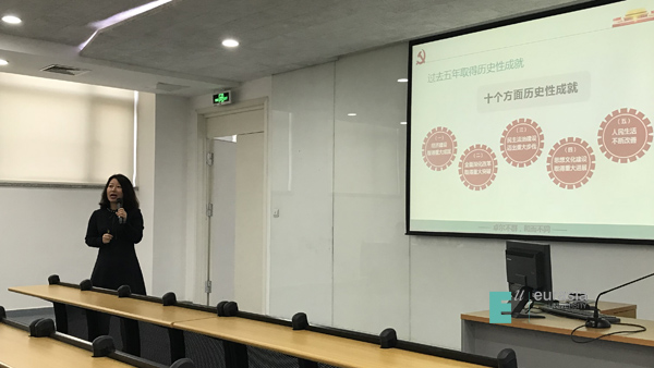 张乐芳助理为学生带来了题为《中共十九大的主题、主要成果和重要意义》的专题课程,以《领航》的视频为导入,进而以抢答的形式向学生介绍了十九大的召开时间、会议议程、会议主题等概况知识,激发学生兴趣。然后以十九大报告所总结的新时代、新思想、新矛盾、新目标,从一个全‘新’的角度与同学们一起探讨这次举世瞩目的盛会。最后,张助理对同学们提出了殷切期望,指出,青年一代是民族的希望和未来,青年兴则国家兴,要想顺利完成或者超前完成目标,需要我们在座的每一位青年为之努力奋斗。