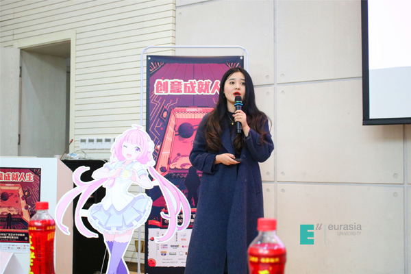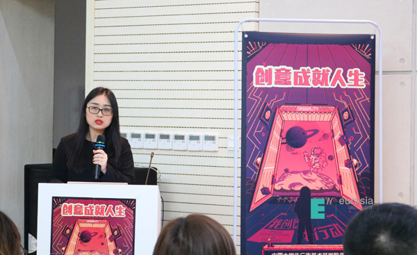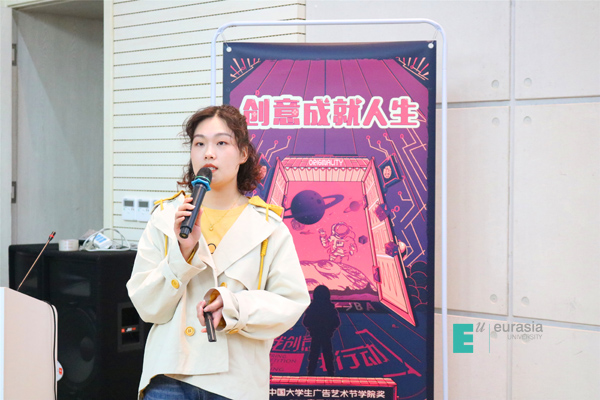 广告人文化集团市场总监孙明晖女士为在场同学们介绍学院奖的奖项设置,讲解参赛策略,并带来“涂缓缓”首届“关爱女生”公益行动宣传,引起了现场同学们浓厚的兴趣。她表示:“此公益宣传是为了让健康更科学。”