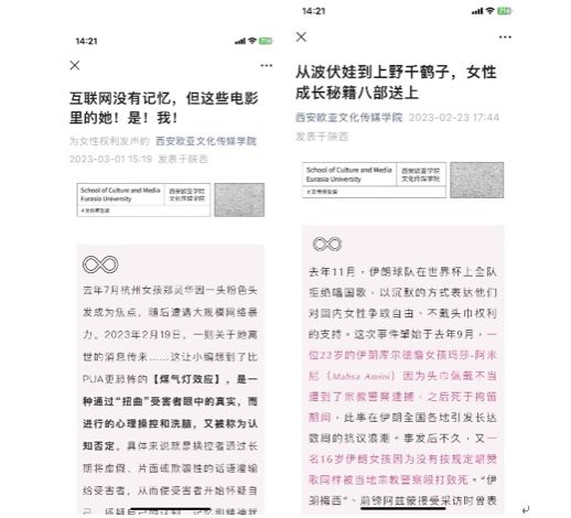 但随着互联网技术的发展和广泛应用,让女性在社交媒体平台中获取了更多的“话语权”。现在有很多的新媒体大号、作者以及女性个体都开始利用平台发声,比如最近很多自媒体都在转载上野千鹤子的演讲,我们文传公众号近期一直在推有关女性的书单、影单,再比如女孩们自发发起的反容貌焦虑、身材焦虑、反“男凝”运动等,都在有意识的唤醒女性意识,消解女性身份迷思,这是非常好的现象和趋势。