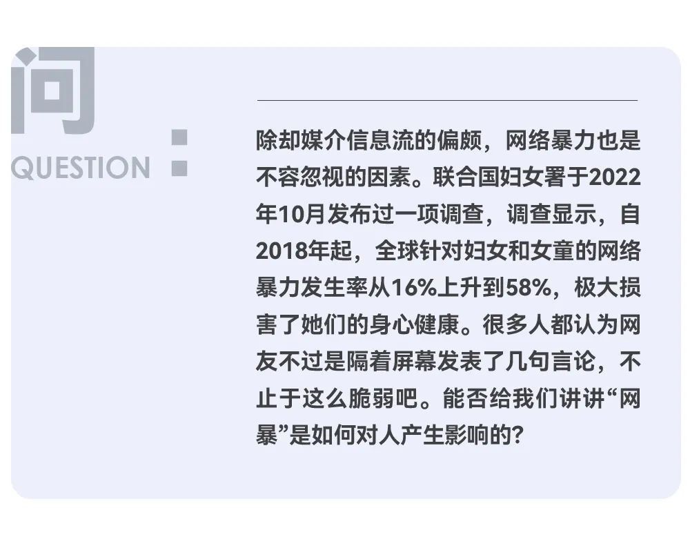 丁:网络暴力是建立在互联网基础上的、现实暴力在网络中的延伸,主要是以言语攻击、形象恶搞、隐私披露等形式呈现,是迫使当事人屈服的“网络攻击型行为”总称。