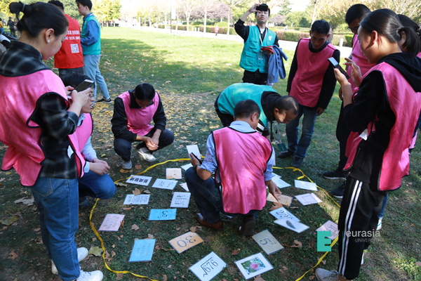 第三关:极速记忆。绳圈内散落有代表数字1~30的各种图案的卡片,1人站在绳圈内把散乱的卡片按顺序依次递交给教练。大家群策群力,快速思考:“乔丹”代表“23”,“食物”代表“15”,“發”代表“8”,“石狮”代表“14”……也有出错的时候,不过不气馁,冷静思考、迅速调整,耶!全部完成!