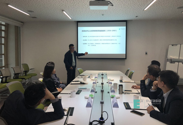 双方在行政中心三楼鸟巢会议室进行了座谈交流。董事长胡建波向邬主任一行做了名为《美国加州高等教育规划对西安市基础教育规划的启示》的报告。通过对美国加州高等教育面临的问题、教育系统的职能划分、招生录取政策及解决的问题等方面的分析,提出西安市未来基础教育改革的发展应从“未来需求、突出问题、硬件规划、软件提升、财务资源、能力”等六个方面开展研究。
