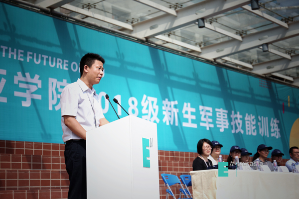 校党委书记许尚年同志向军训团团长任光辉少校授军训团团旗。国际青年社区文化传媒学院四营二十二连新生崔泽平,代表代表2018级全体新生发言,他表达了对大学生活的向往与对崭新未来的无限憧憬。他表示:军训作为大学旅程的第一站,能够帮助我们尽快地适应大学生活;更好地领悟纪律与规范的含义,理解团队和协作的意义;更好的塑造坚韧、宽容、自立、自强的品质,从而成就更好的自己。