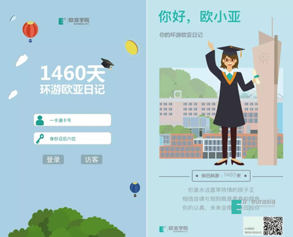 《1460天 环游欧亚日记》是基于学生在校4年的大数据生成一个数据查询平台,作为毕业礼物送给毕业生。这个数据平台既汇集了自己大学四年的生活学习轨迹,承载了一段青春成长的故事,也包含了母校对毕业生的祝福和期许。平台汇集了学生个人基础信息、专业及课程设置、到课率及考试成绩、得奖、校内活动轨迹、社交、消费、饮食及卫生习惯、阅读习惯等,并且能够生成一张的个人海报,进一步促成分享传播。