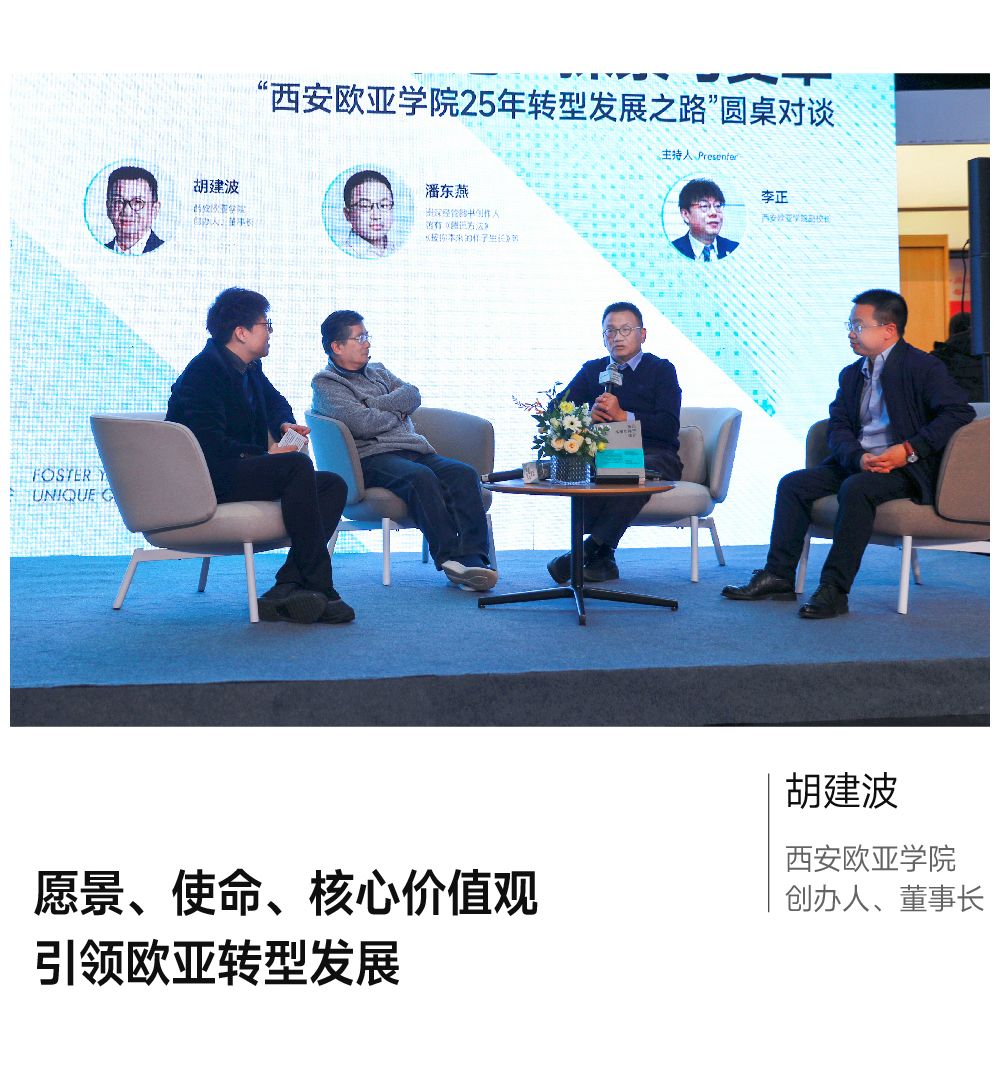胡建波:欧亚每一次的转型与发展,不是说为了求变而变,欧亚一路变革有赵炬明教授和党晟先生这样的一批学者专家陪伴。最初我认识赵老师的时候,他从加拿大回到中国开始研究创新型大学,从那个时候开始,我感觉创新型大学可能就是欧亚的样子,后来赵老师做学校战略管理的具体研究,帮欧亚起早战略规划,我正好在中欧商学院学习,有了这方面的积累,才有了后来请咨询公司来给欧亚做规划的契机,做着做着我们自己的认知升级了,现在我们也给很多大学提供咨询服务。
