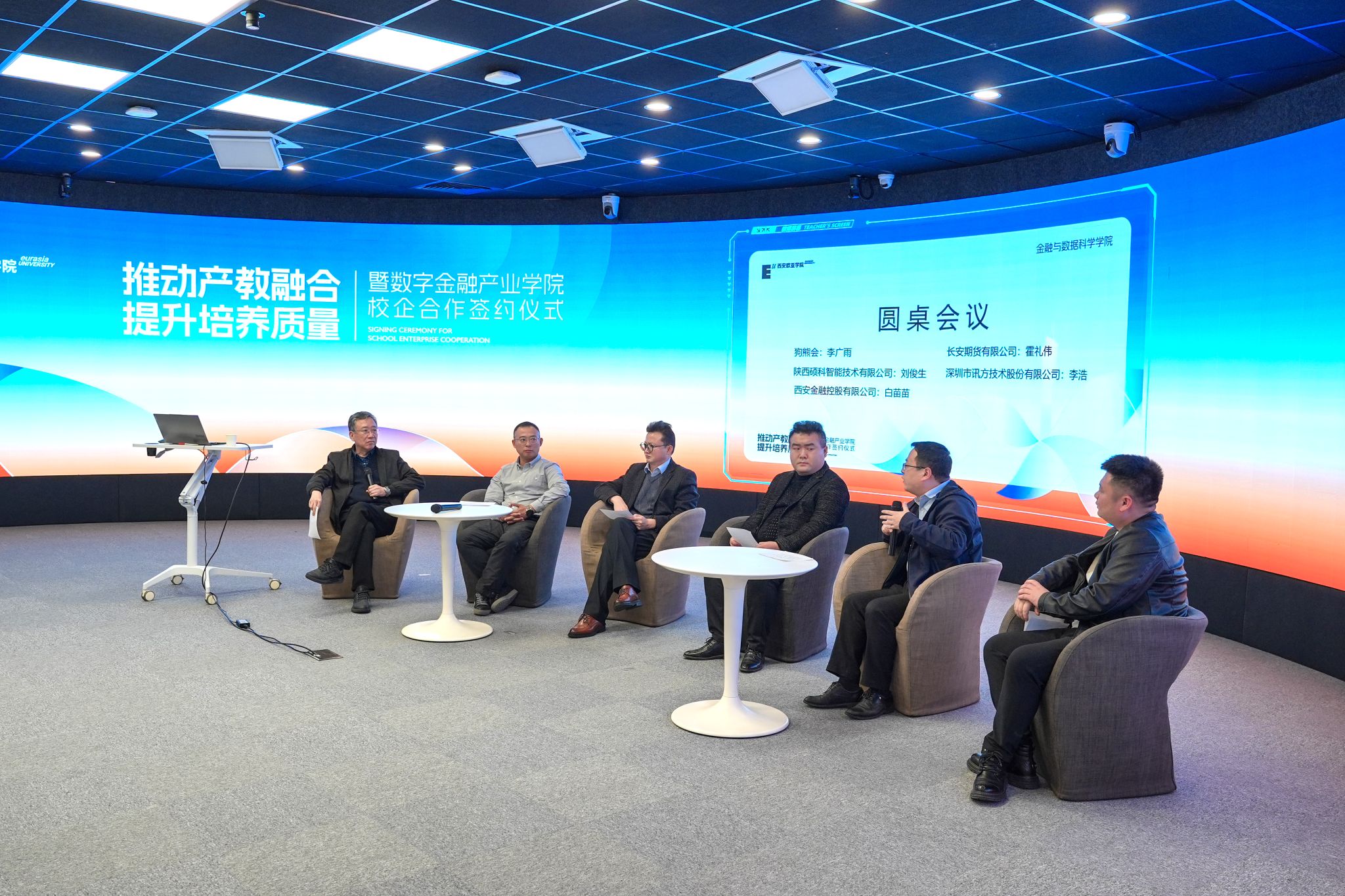 圆桌会议结尾,各位嘉宾针对“经济统计学专业学生必备职业技能”、“金融科技人岗匹配的突破点”等问题,与金融数据科学学院的教师们进行了友好的交流互动,共同助力金融科技行业产教融合情境下的人才培育。