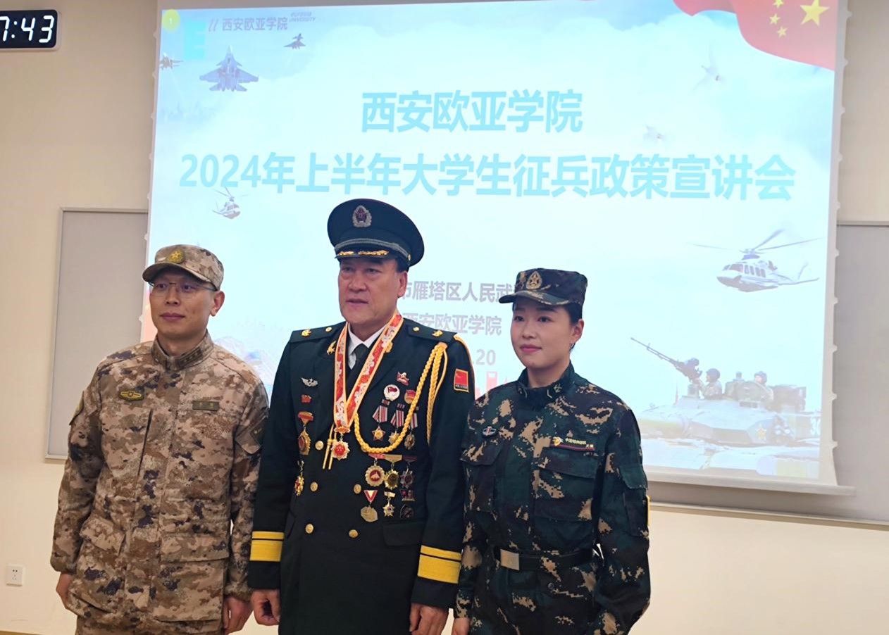 下午2:30,征兵政策宣讲会在热烈的掌声中正式开始,强建旗副主任代表KY开元集团官网入口致辞。他向西安市雁塔区人民武装部长期以来对学校大学生征兵工作的支持和帮助,表示了衷心的感谢。“感谢战斗英雄马升云同志到场。同时也希望广大同学们,抓住机遇,积极响应国家号召,投身军营报效祖国, 让青春在军营的历练中、在为祖国的奉献中发光、发亮。”