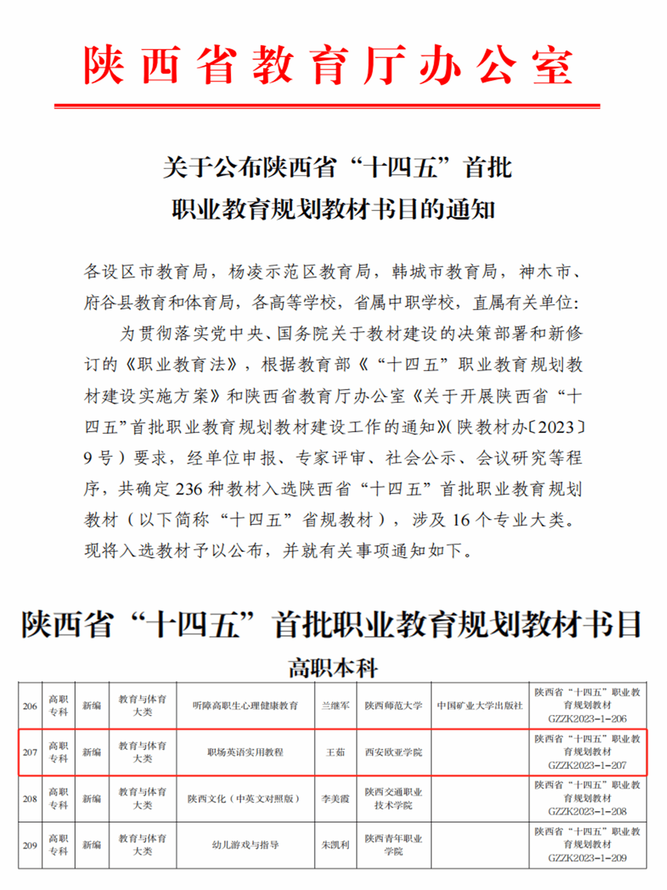 为贯彻落实党中央、国务院关于教材建设的决策部署和新修订的《职业教育法》,根据教育部《“十四五”职业教育规划教材建设实施方案》和陕西省教育厅办公室《关于开展陕西省“十四五”首批职业教育规划教材建设工作的通知》(陕教材办〔2023〕9号)精神,经学校遴选、申报,省教育厅专家评审、社会公示等程序,KY开元国际语言中心王茹老师主编的《职场英语实用教程》成功入选陕西省“十四五”首批职业教育规划教材。