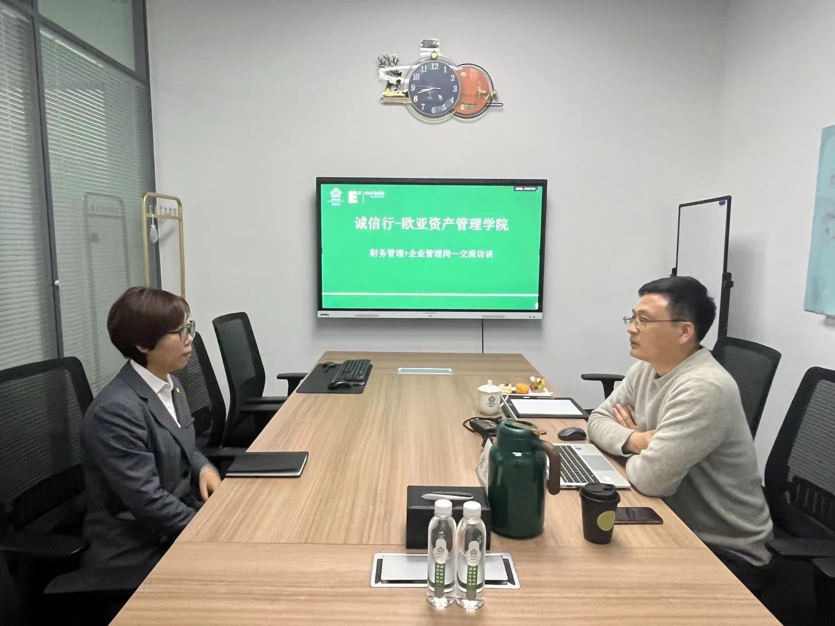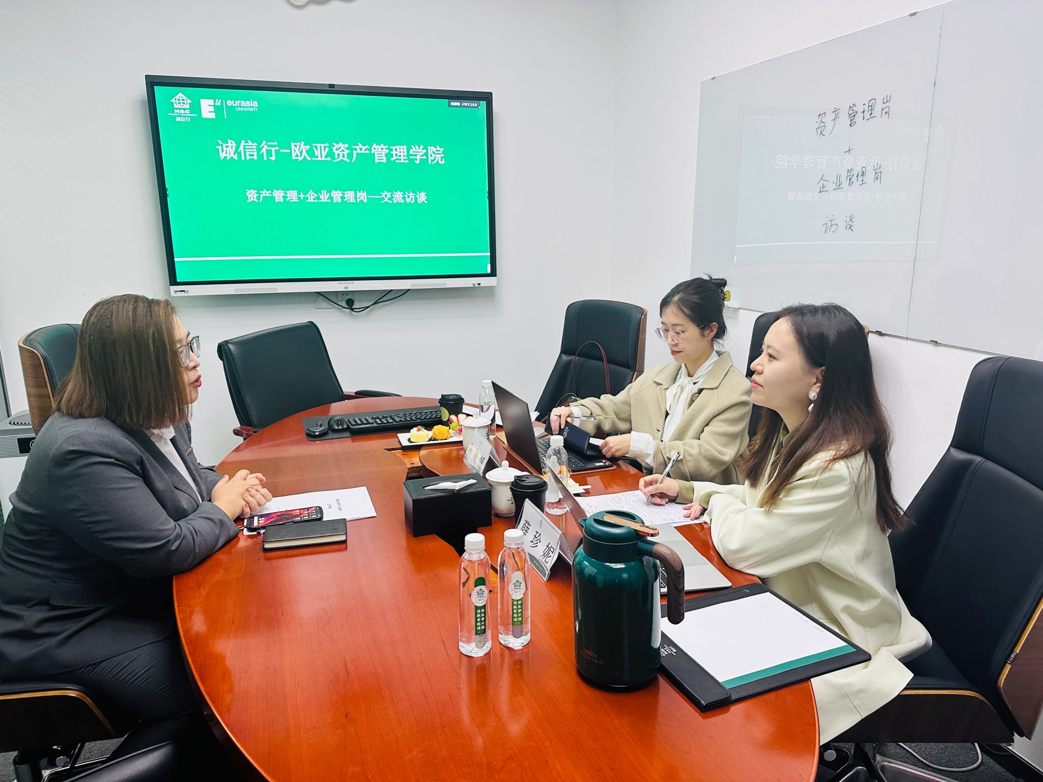 诚信行控股有限公司董事长王宏杰、副总裁魏利利等高层管理人员与会计学院谢涛院长、会计学院财务管理专业负责人宋粉鲜副教授及职业教育学院房地产服务系主任赵敏副教授等就产业学院组织架构、运行机制、议事规则等展开深入探讨,谢涛院长就欧亚—诚信行产业学院建设阶段性工作做总体汇报,明确校企合作的五个关键点、产业学院画像及下一步工作计划等工作内容。同时,会计学院财务管理课程中心副主任薛珍妮、财务管理专业专任教师郭东东和陈媛媛、职业教育学院房地产专业负责人杨星分别就资产管理、财务管理、物业管理等三个核心议题与诚信行控股相关品牌高管、中层领导及基层骨干进行深入调研访谈。