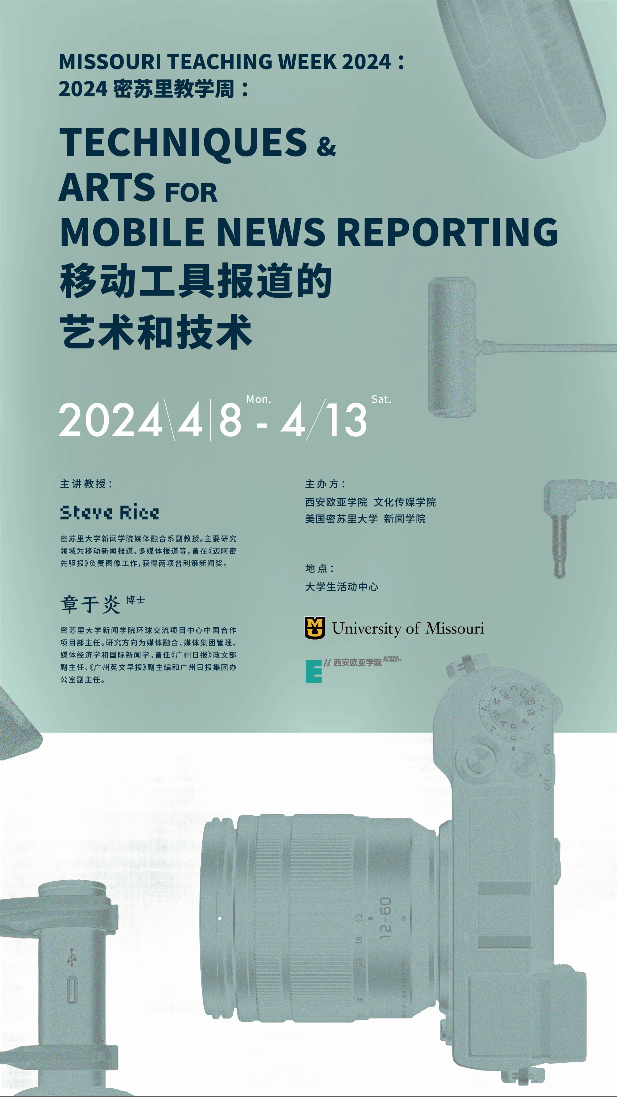 2024年4月8日-4月13日,以“移动工具报道的艺术和技术”为主题的2024密苏里教学周在KY开元集团官网入口文化传媒学院举办。分院特邀美国密苏里大学新闻学院副教授史蒂夫·赖斯(Steve Rice)、环球交流项目中心中国合作项目部主任章于炎博士,以教授讲座与学生工坊相结合的形式,带领大家探讨移动新闻报道的艺术和技术,了解移动设备在新闻报道中的应用,从而更灵活地应对变化的新闻传播环境。