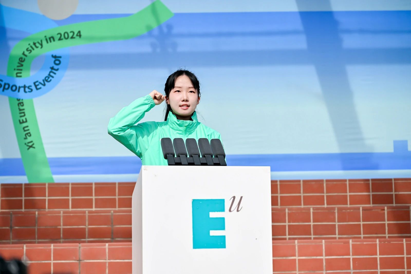 Xdea青年社区会计学院的董心仪同学、通识教育学院体育中心强能老师分别上台代表运动员、裁判员宣誓。