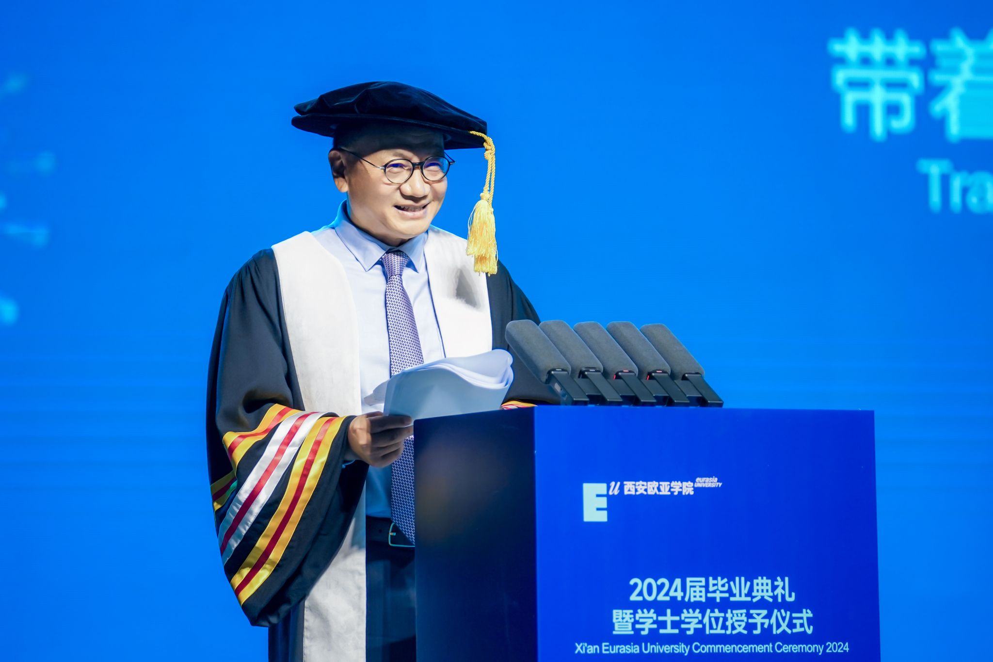 首先,我要向在座的毕业生表达衷心的祝贺!祝贺你们顺利毕业(掌声)。其次,感谢欧亚所有教职员工、合作企业的朋友们,欧亚学子每一天的成长与收获,都是大家共同努力的结果。
