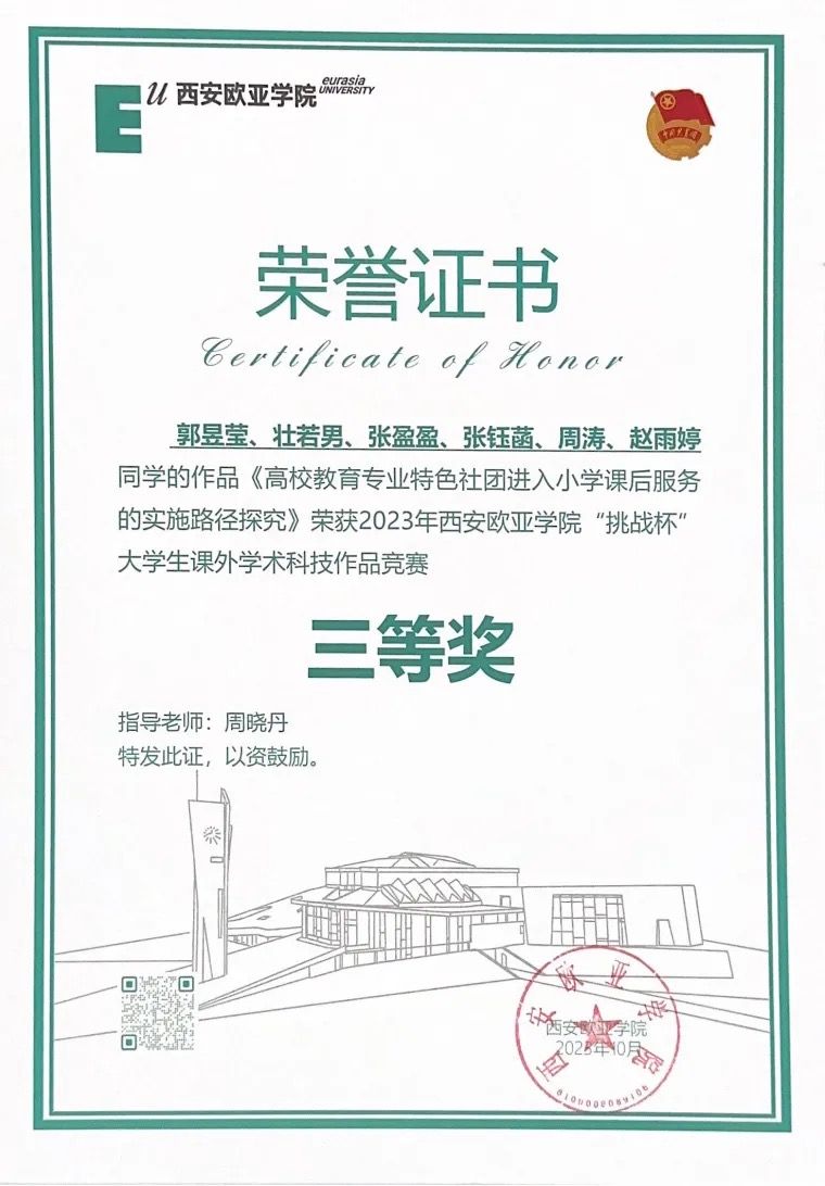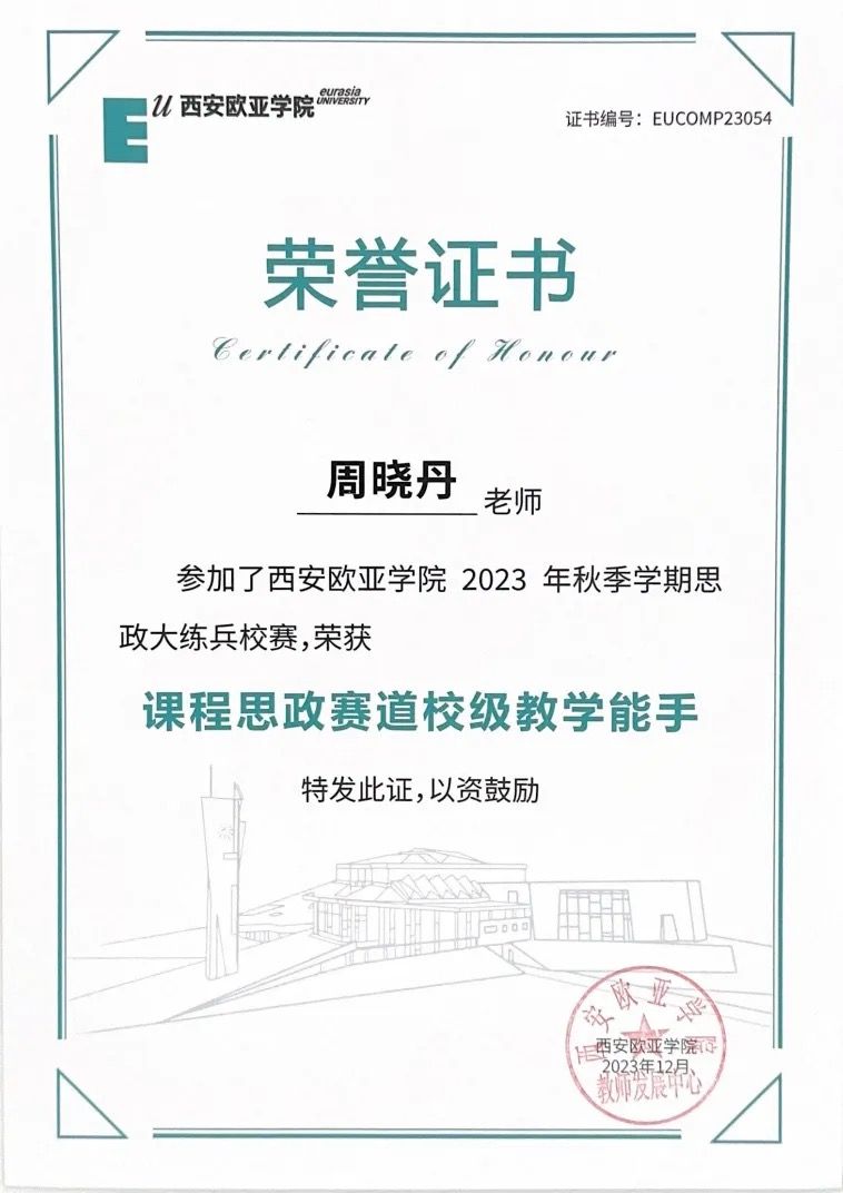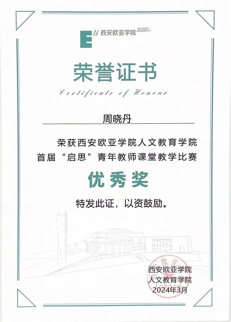 在周晓丹的带领和学生们的支持下,《中外教育史与教育哲学》在课程竞赛、实践活动等方面收获颇丰。2021-2023年,学校大学生创新创业训练计划立项5次、学生发表学术论文3篇、学生多次在校级“挑战杯”竞赛获奖。同时,课程于2023年上线新华网“新华思政”展播平台,获评为校级课程思政示范课、校级教改项目和人文教育学院教改项目。周晓丹更是多次荣获校级教学比赛奖项。