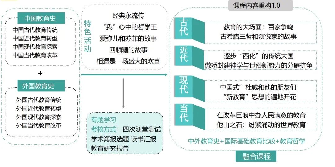 课程主要以中外教育史为框架,以教育哲学为侧切点,主要包括五大模块内容:中外古代教育传统、中外近代教育转型、中外现代教育史、中外当代教育史和教育哲学。同时基于课程设置和资源本身,本门课程进行了两个阶段的改革——