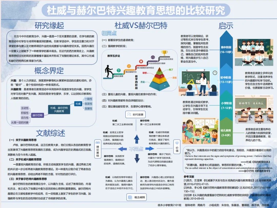 “《中外教育史与教育哲学》这门课程,不仅是历史性的方式和总结,对我而言更是时代教育精神的教化与形塑。这门课程前期以知识的讲授为主,而后期通过学术海报的制作,知识达到了由图示转变到知识的平衡,真正做到了学-研-产,同时通过这门课程我调整了我的知识结构,重塑了价值谱系,转化了研究视角的范式,形成了自身的教育观和儿童观,在后期成为一名老师的路上受益匪浅。”小学教育2020级学生林坚说。