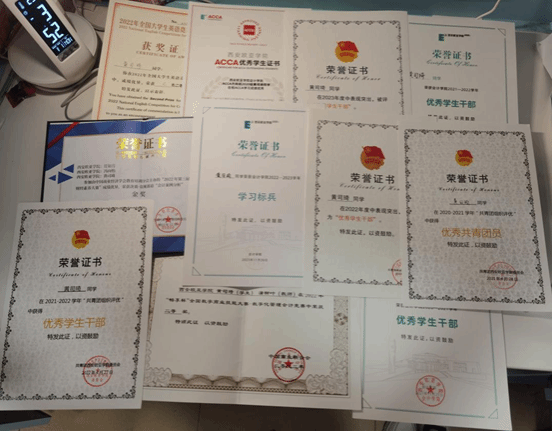欧亚ACCA班采用中英双语授课,在校四年,黄司琦顺利通过了ACCA BT、MA、FA、LW、TX、FR全球统考,获得了ACCA初级商业证书。她还在老师的带领下参加了丰富的商科竞赛,收获2022年大学生财经素养大赛常规赛道“会计案例分析”金奖、2022年“畅享杯”全国数字商业技能大赛数字化管理会计竞赛二等奖、2022年全国大学生英语竞赛C类二等奖等荣誉,并多次获得校优秀学生干部、学习标兵、ACCA优秀学生。