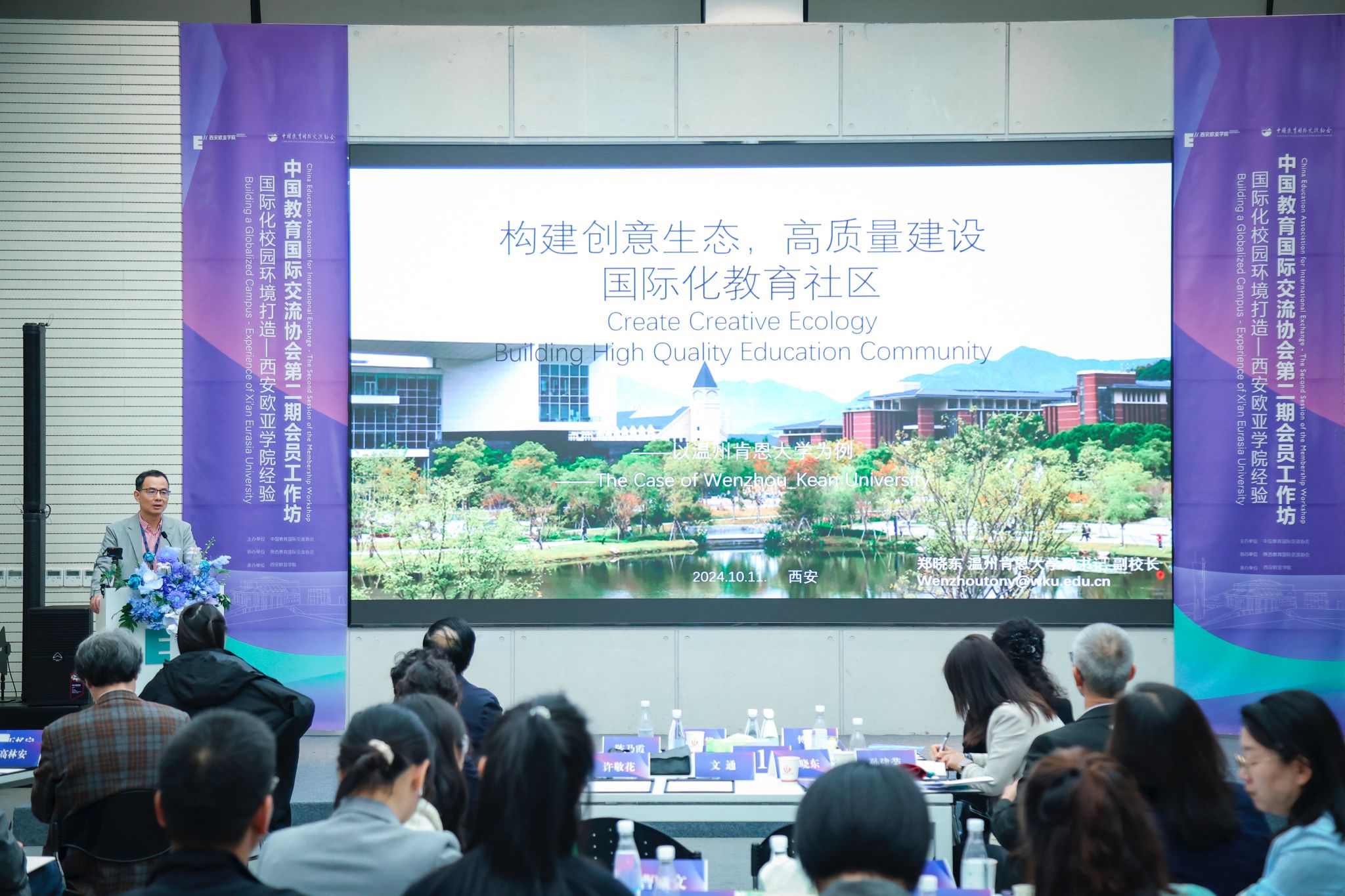 温州肯恩大学党委副书记、副校长郑晓东以“构建创意生态,高质量建设国际化教育社区”为主题作专题报告。郑晓东从大学的历史起源出发,结合世界各地著名大学的发展历程,通过古今中外大学校园的对比,深入探讨了不同文化背景下校园建设的独特性与共同点。他特别强调,未来大学校园不仅是学术和知识传播的空间,更应成为连接文化、促进创新的国际化交流平台。这为与会者提供了一个全新的视角,帮助大家更好地理解如何将校园作为推动国际化教育的重要载体。
