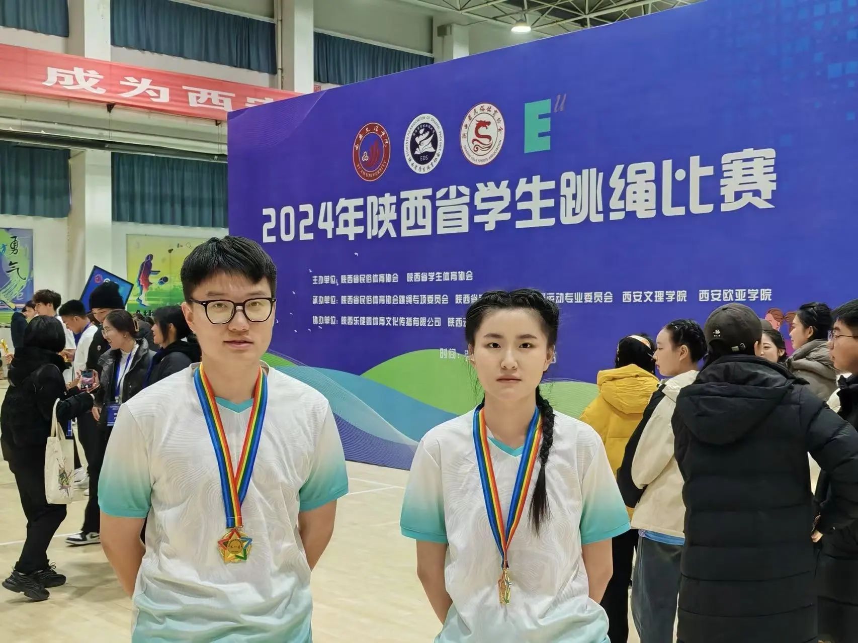 在比赛时其实我们也出了一些差错,在参加大学生甲组混合组双人车轮跳花样规定基础套路的比赛时,不同的动作为一整套循环,于越在比赛过程中缺失了一套动作,但是源于我们长久以来的默契,我自然而又流畅地接住了下个动作。最终,我们成为全场完成度、完整度最高的队伍,获得了2024年陕西省学生跳绳比赛一等奖。