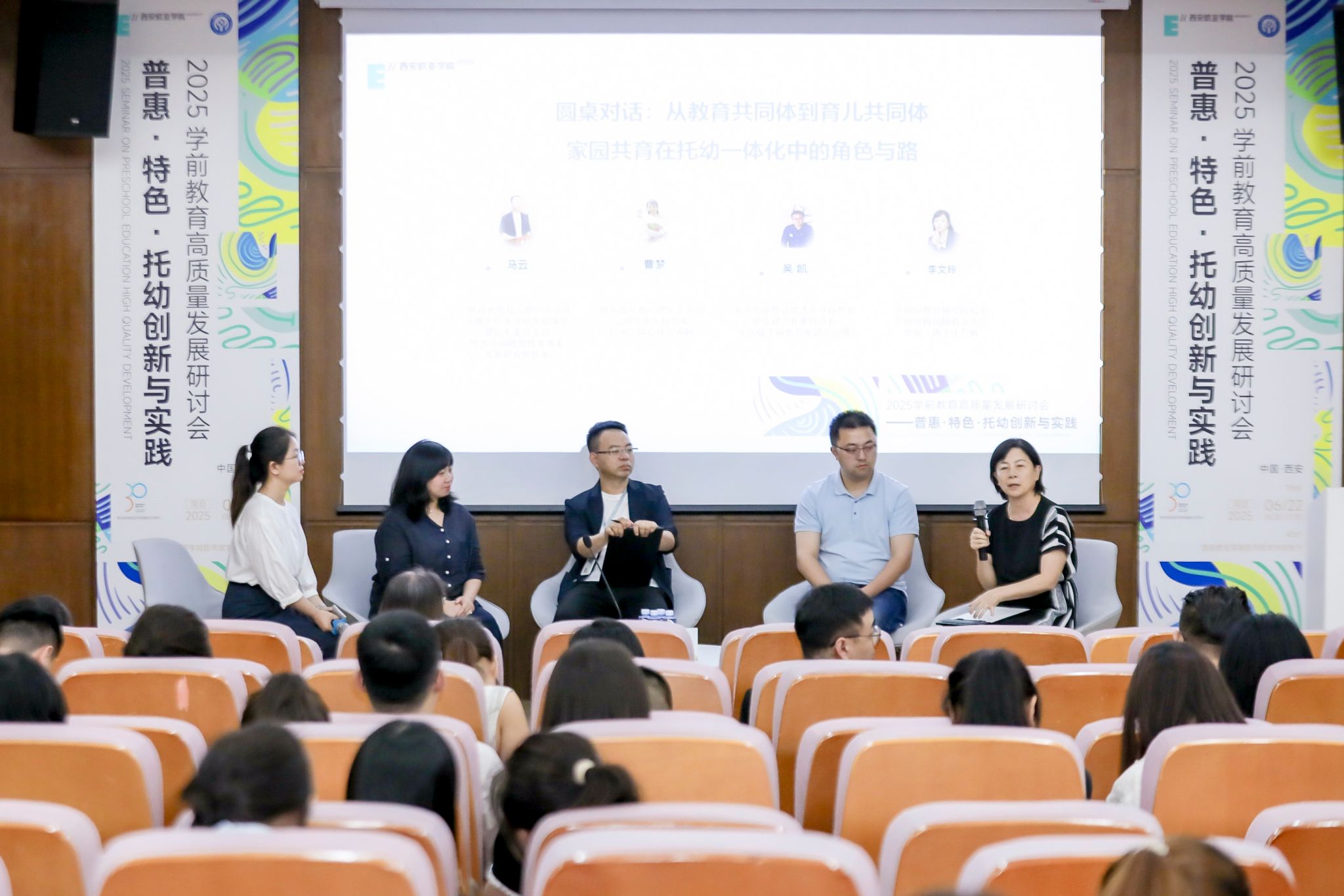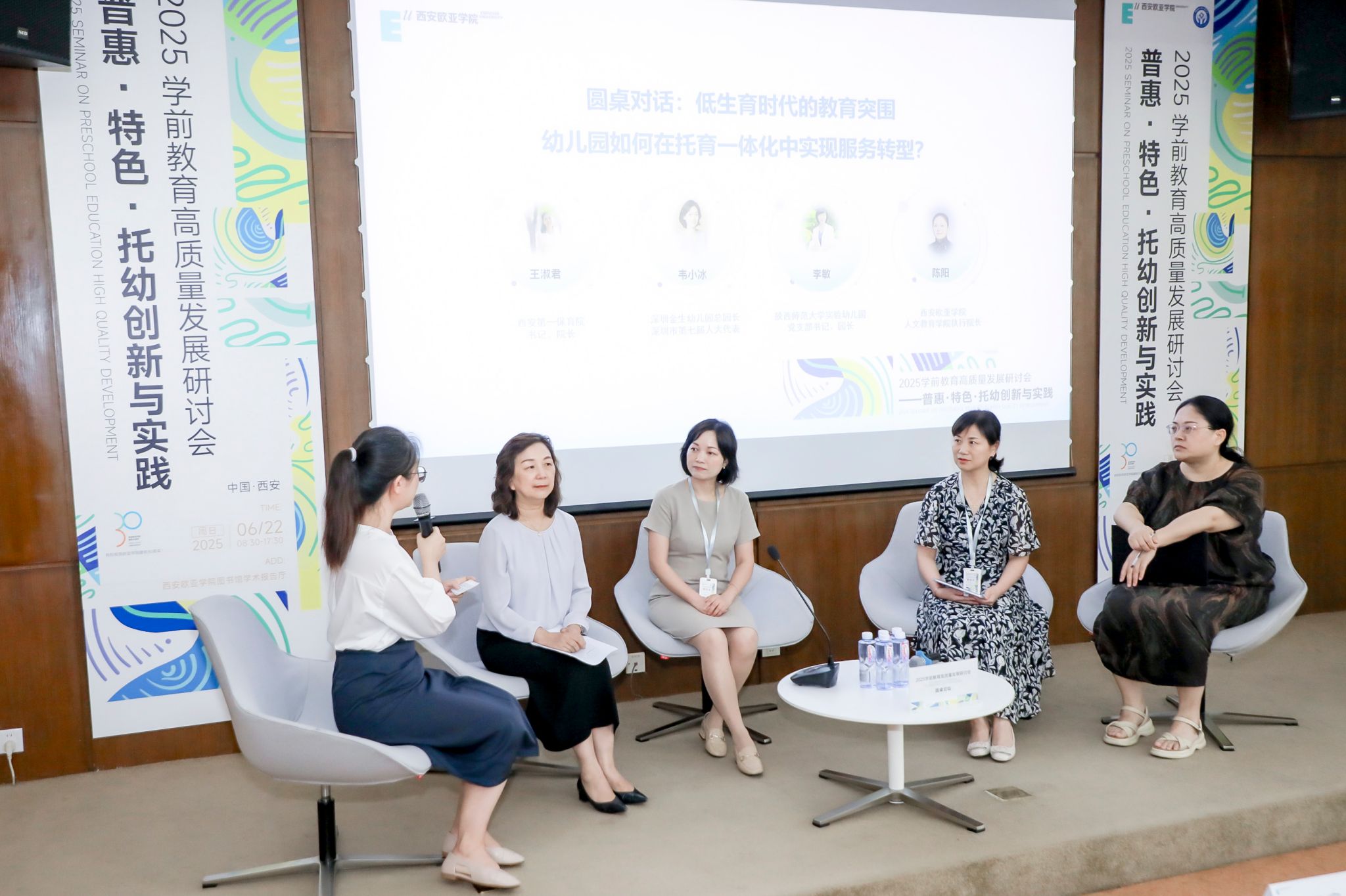 上半场与会嘉宾围绕“低生育时代的教育突围:幼儿园如何在托幼一体化中实现服务转型”展开了深入讨论。西安市第一保育院的王淑君园长、深圳新生幼儿园的韦小冰园长、陕西师范大学实验幼儿园的李敏园长以及西安欧亚人文教育学院陈阳院长分别从政策准备、课程体系构建、师资培养等角度分享了各自的观点和实践经验。