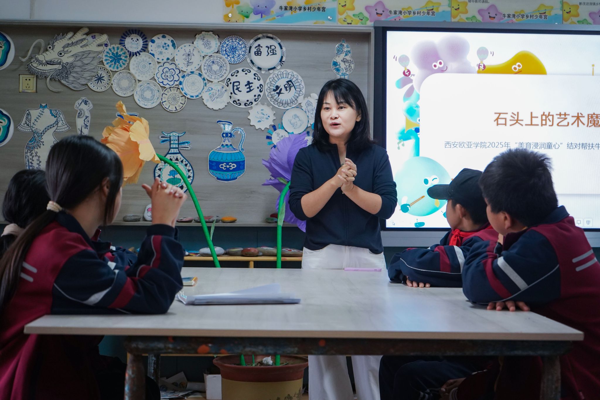 9月22日,在牛家湾小学教育环境设计与改造项目完满竣工之际,项目师生团队为孩子们准备了美术文具礼物,公益艺术课“石头上的艺术魔法”也随即开展。该课程由耿暖暖、徐娜及行业教师张伟共同指导,参与环境设计与改造项目的实习学生辅助教学,将校园环境中的“石文化”主题延伸至动态课堂,有效激发了学生的艺术兴趣与创造力,实现了美育对童心的深层浸润。