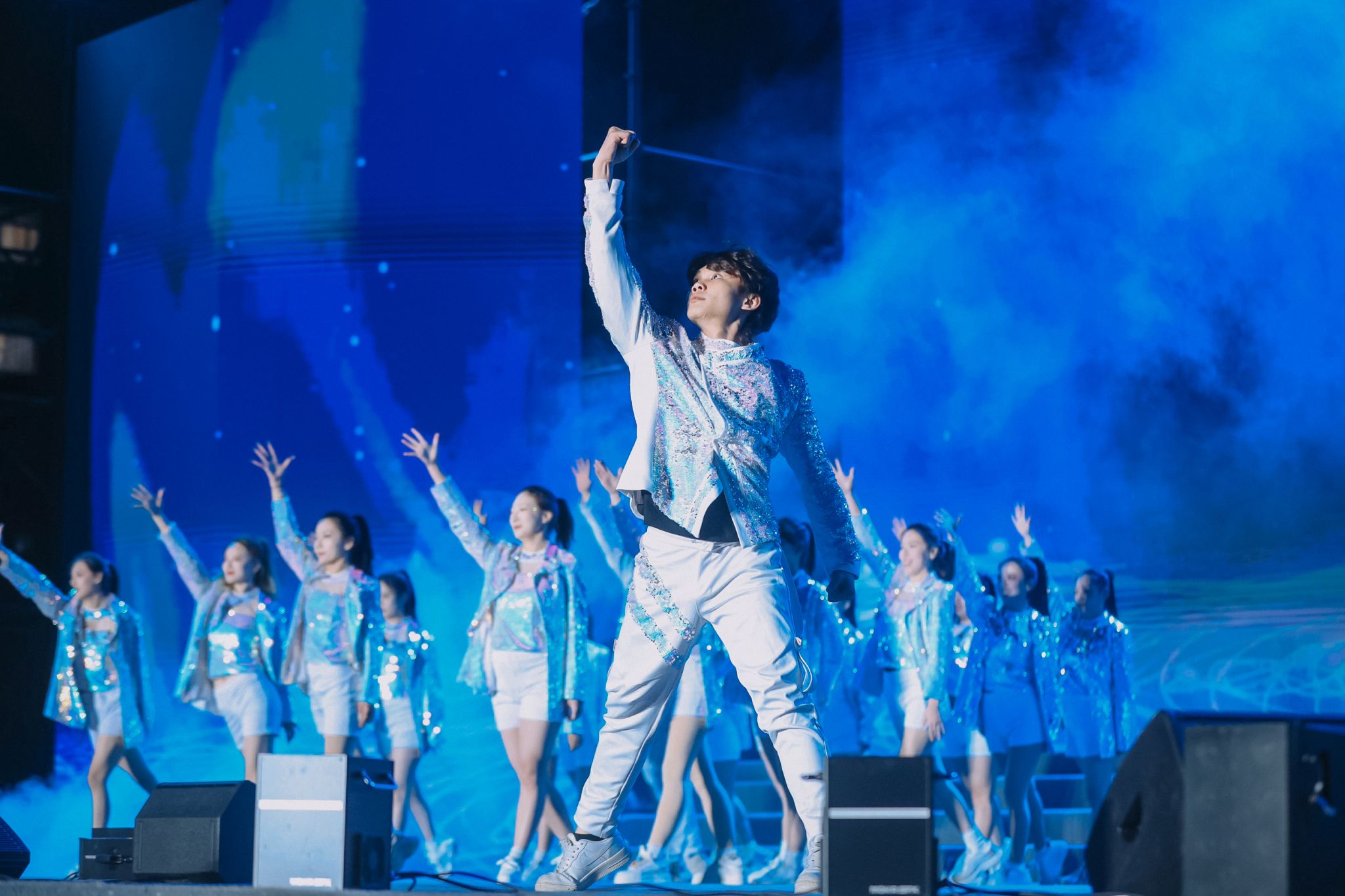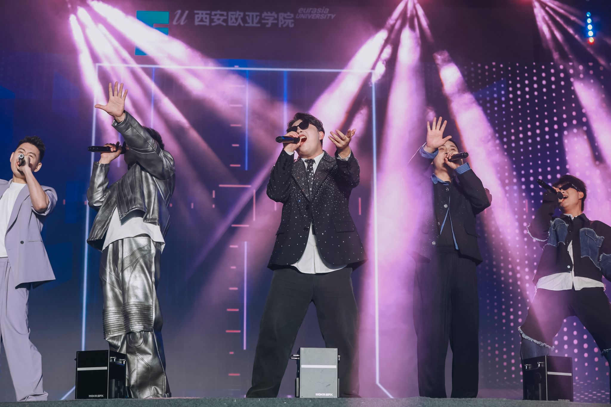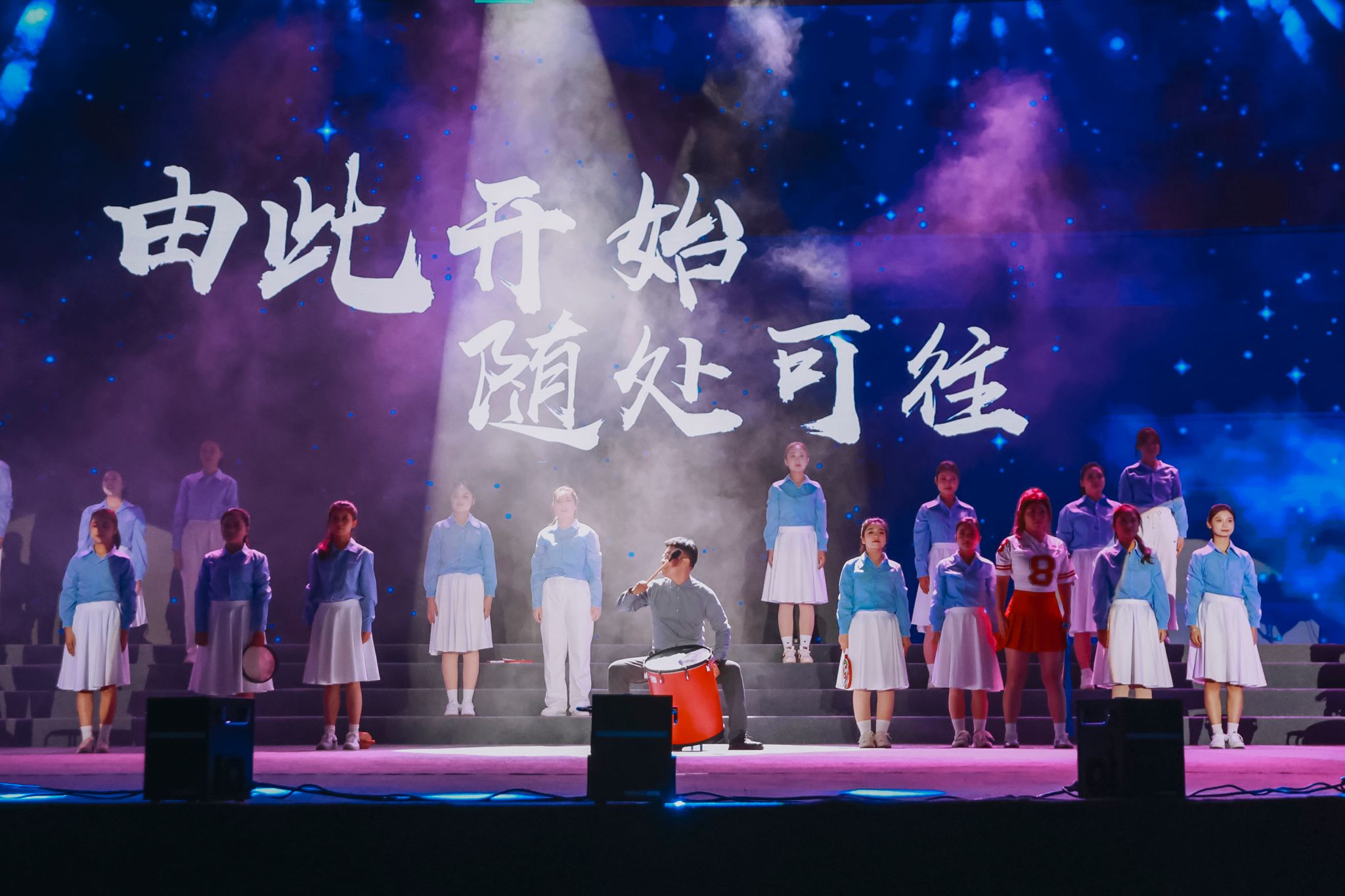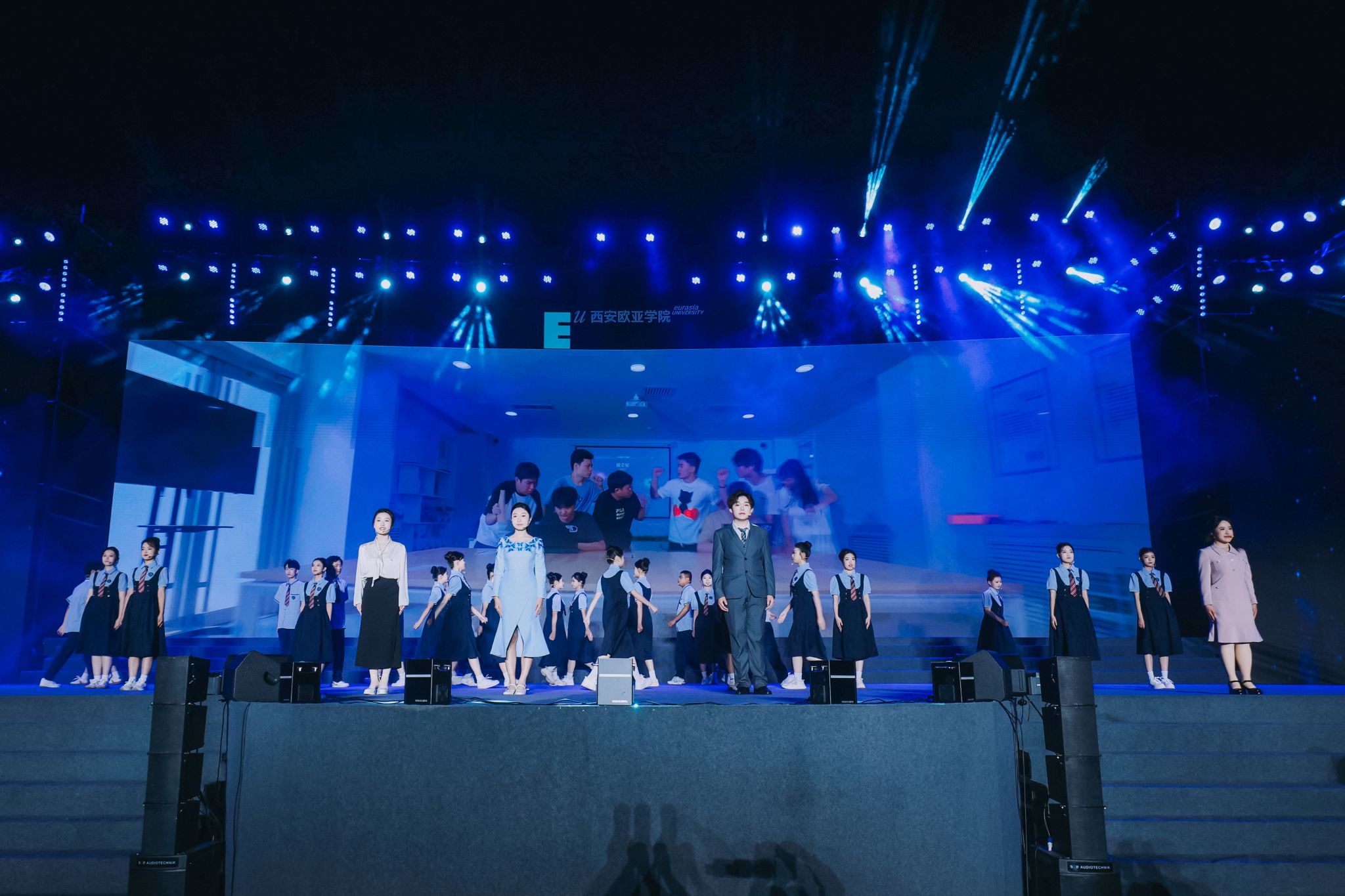 随后,胡建波和副校长李正、吉他社的同学一起,演唱了影响一代人的摇滚金曲《蓝莲花》,用音乐致敬30年的青春。歌声响起,灯光星海闪烁。那一刻,音乐不再只是旋律,而是一种力量——来自欧亚的信念与精神。歌声穿越时间,连接了30年的追梦者,也照亮了此刻的青年面庞。