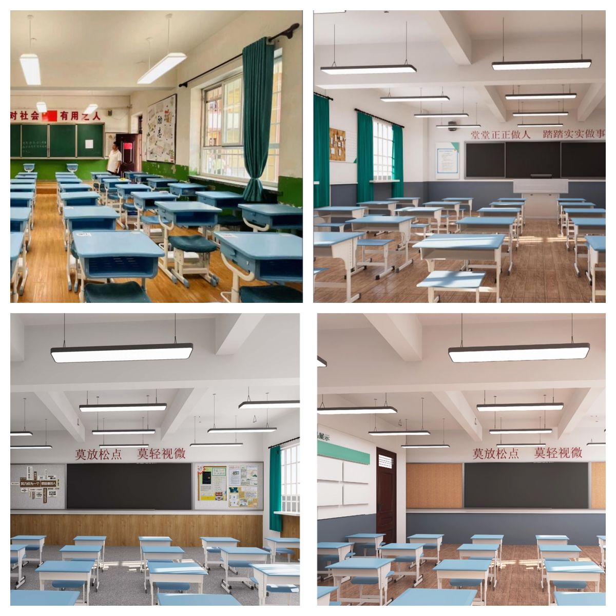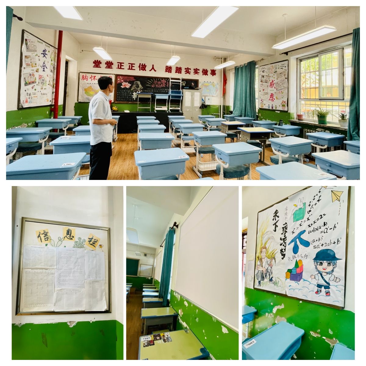 7月19日至8月15日,项目团队指导完成了昆山中学教室的基础施工,对墙面、顶面的重新粉刷装修,并对展示文化墙面的功能及呈现效果进行细化设计。根据校园环境后期将持续改造建设的需求,设计赋予班级独特的色彩符号,迎合清涧地域文化及校园文化。