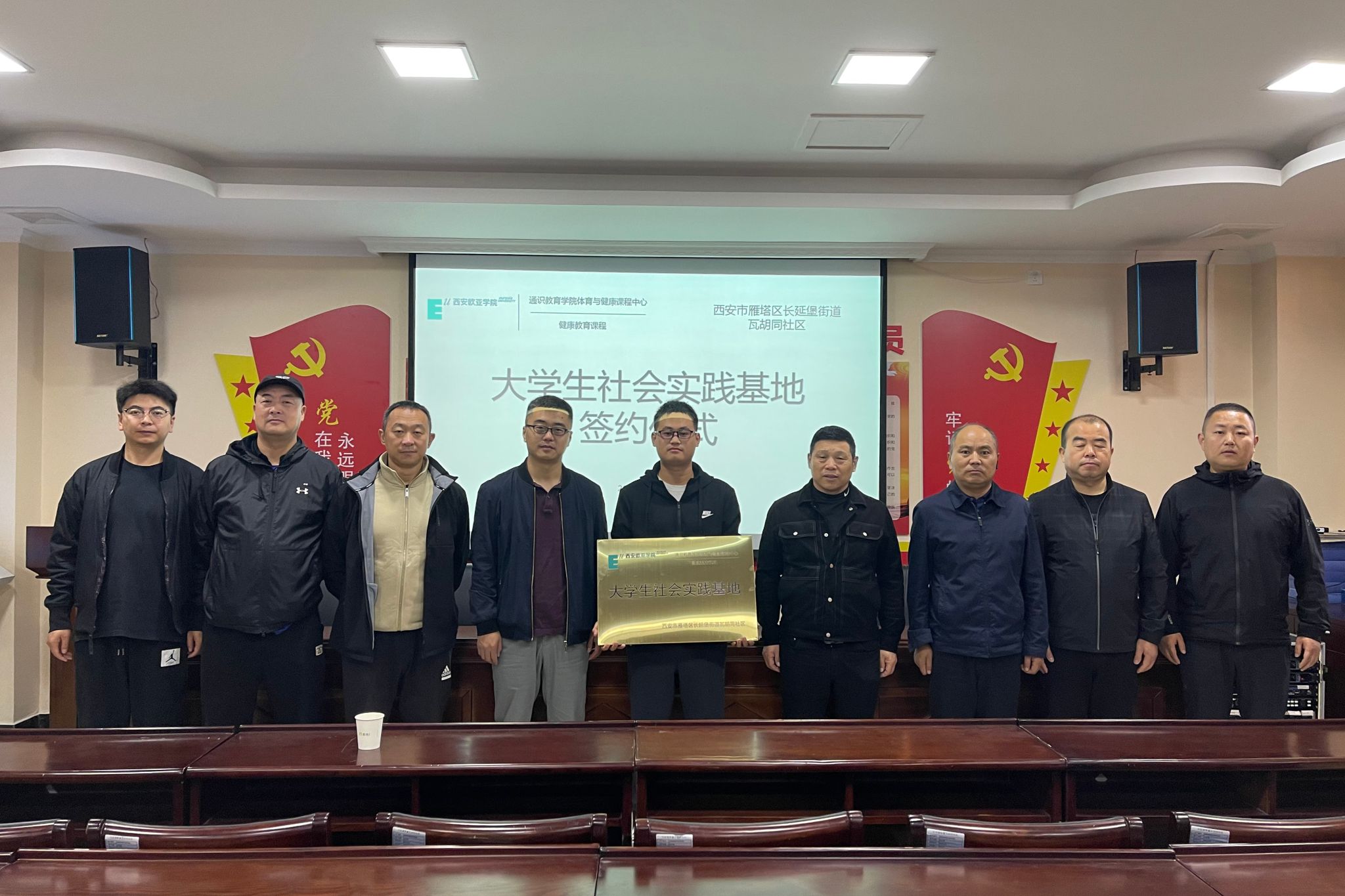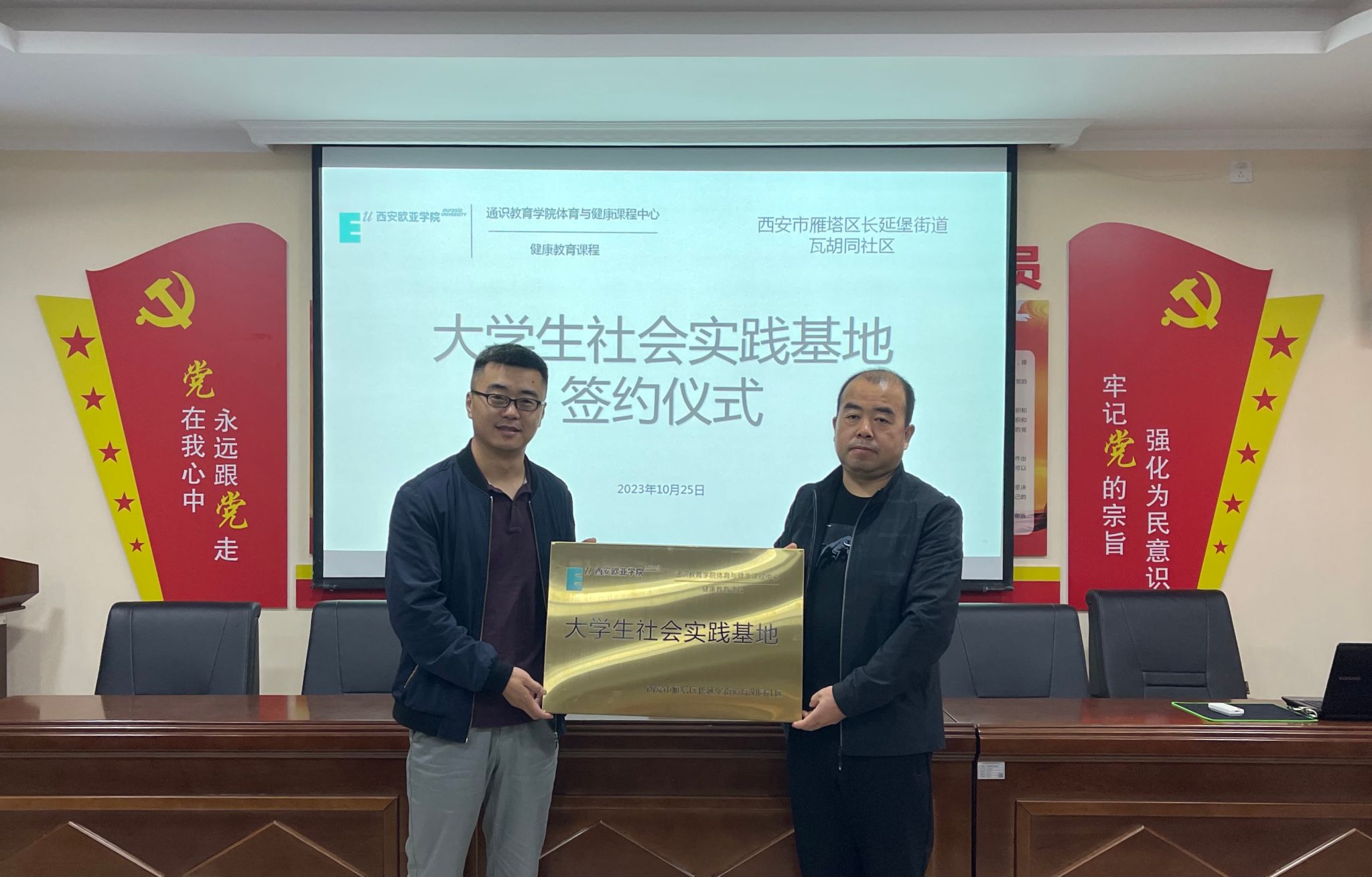 2023年10月25日,KY开元通识教育学院体育与健康课程中心与西安市雁塔区瓦胡同社区举行校地合作座谈会,双方就共建大学生社会实践基地签署合作协议并举行挂牌仪式。瓦胡同社区党委书记崔小文、党委副书记崔延安、委员王宏伟、王盼,KY开元通识教育学院院长助理段永刚、体育与健康课程中心副主任高鹏等出席签约仪式。
