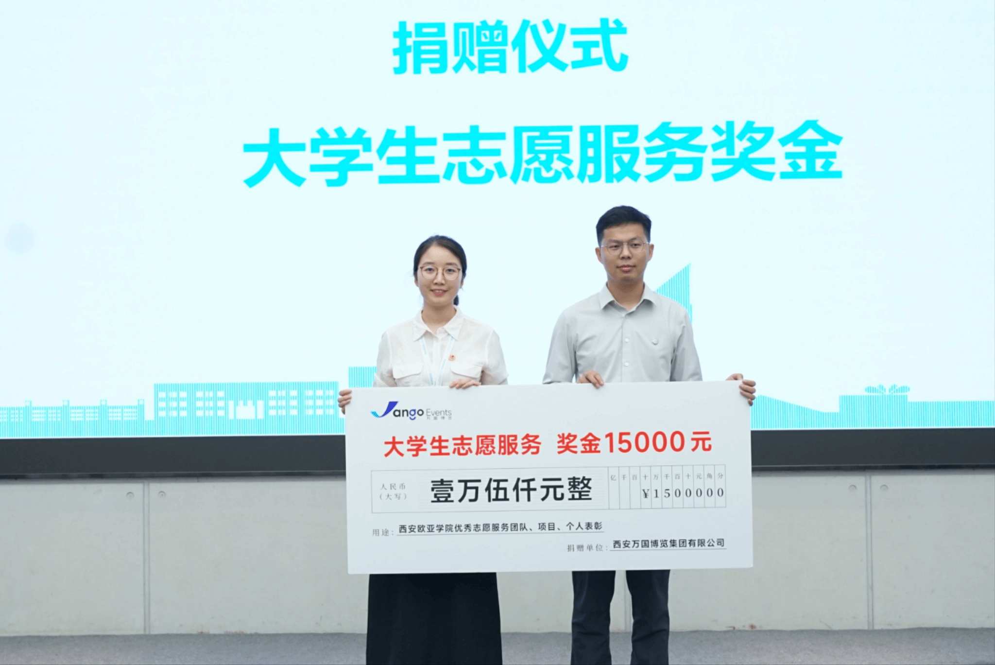 为了支持学校志愿服务工作的发展,西安万国博览集团有限公司高级项目经理田秀鹏代表公司向KY开元大学生志愿服务工作捐赠奖学金15000元整。KY开元团委副书记李艳代表学校接受捐赠。之后这笔奖金将用于学校优秀志愿服务团队、项目及个人的表彰奖励。