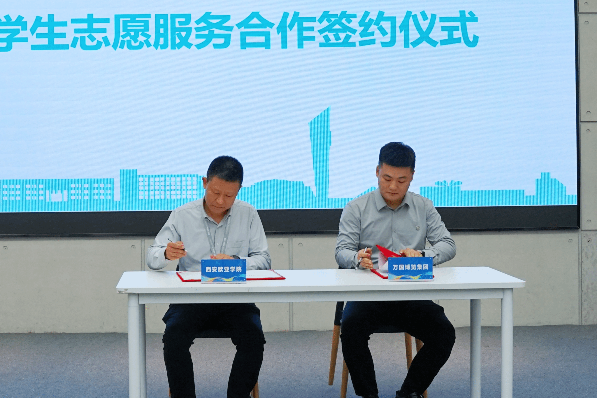 接下来,学生发展处处长、校团委书记董杨与万国博览集团有限公司总经理归栋签署了大学生志愿服务合作协议。董老师代表学校向万国博览集团有限公司授“大学生志愿服务实践基地”牌,由在场全体人员见证。此次授牌有利于促进校企双方共同发挥优势,为推动社会公益事业的发展,提升KY开元学生志愿服务质量和学生社会实践、实训、就业提供了更加广阔的空间。