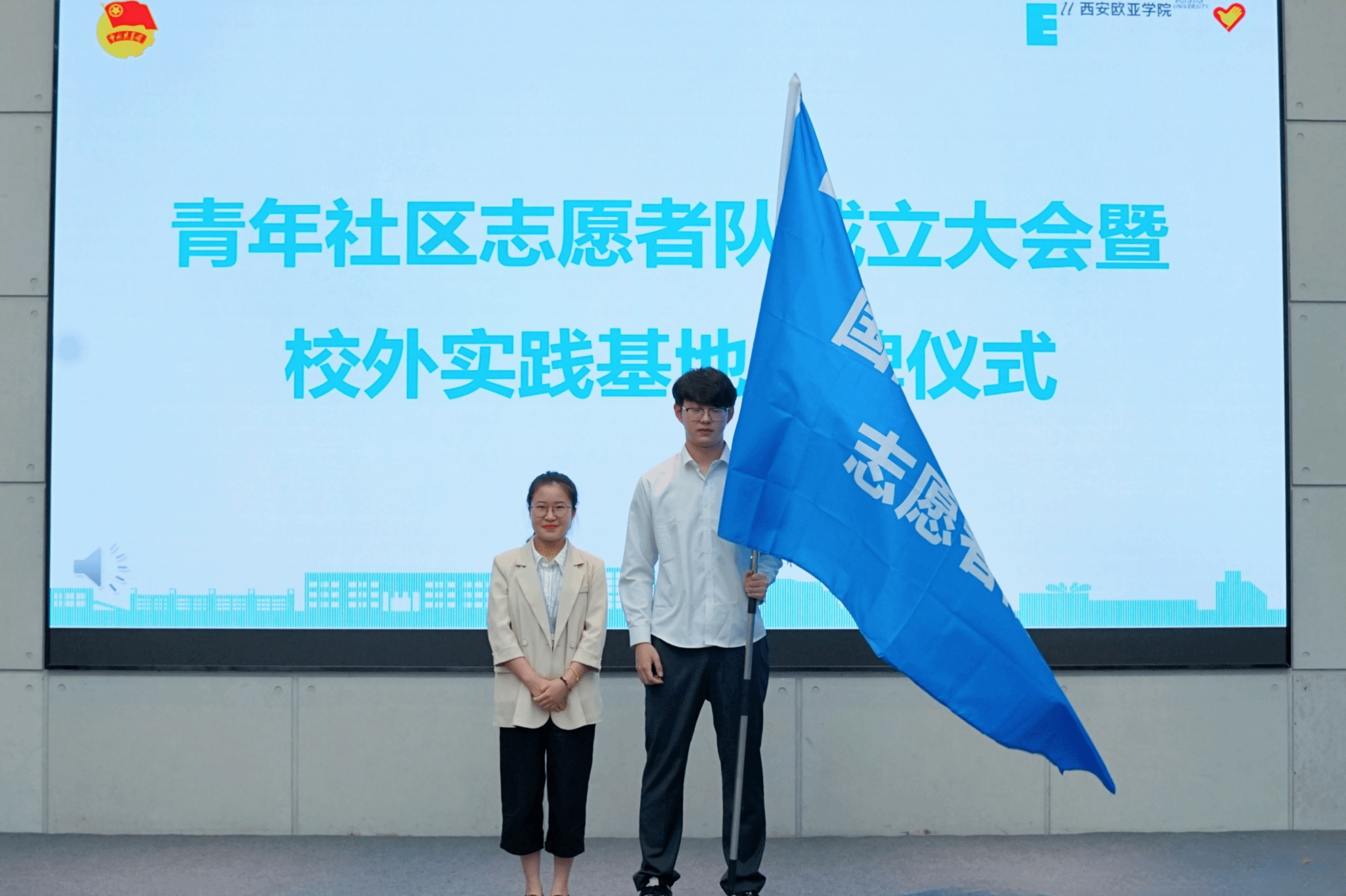 在仪式开始前,全体与会人员奏唱中华人民共和国国歌,礼毕,青年社区志愿者队成立大会暨校外实践基地授牌仪式正式拉开序幕。首先,各青年社区分党委书记分别向青年社区志愿者授队旗。一面旗帜,代表着一份责任、一份担当,带着大学生的热情与朝气,不断探索与实践、积极参与志愿服务活动,展现当代大学生的青春风采。