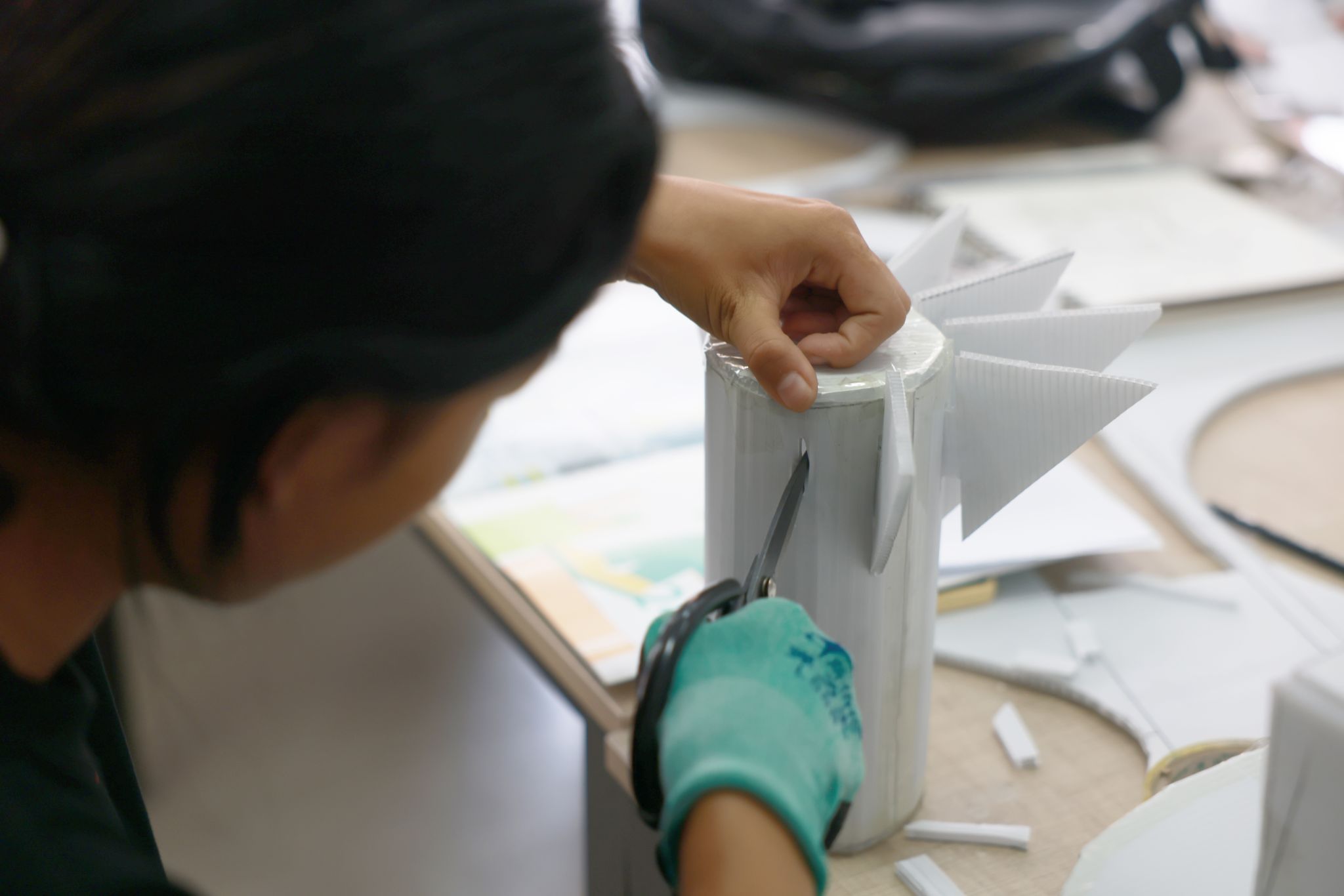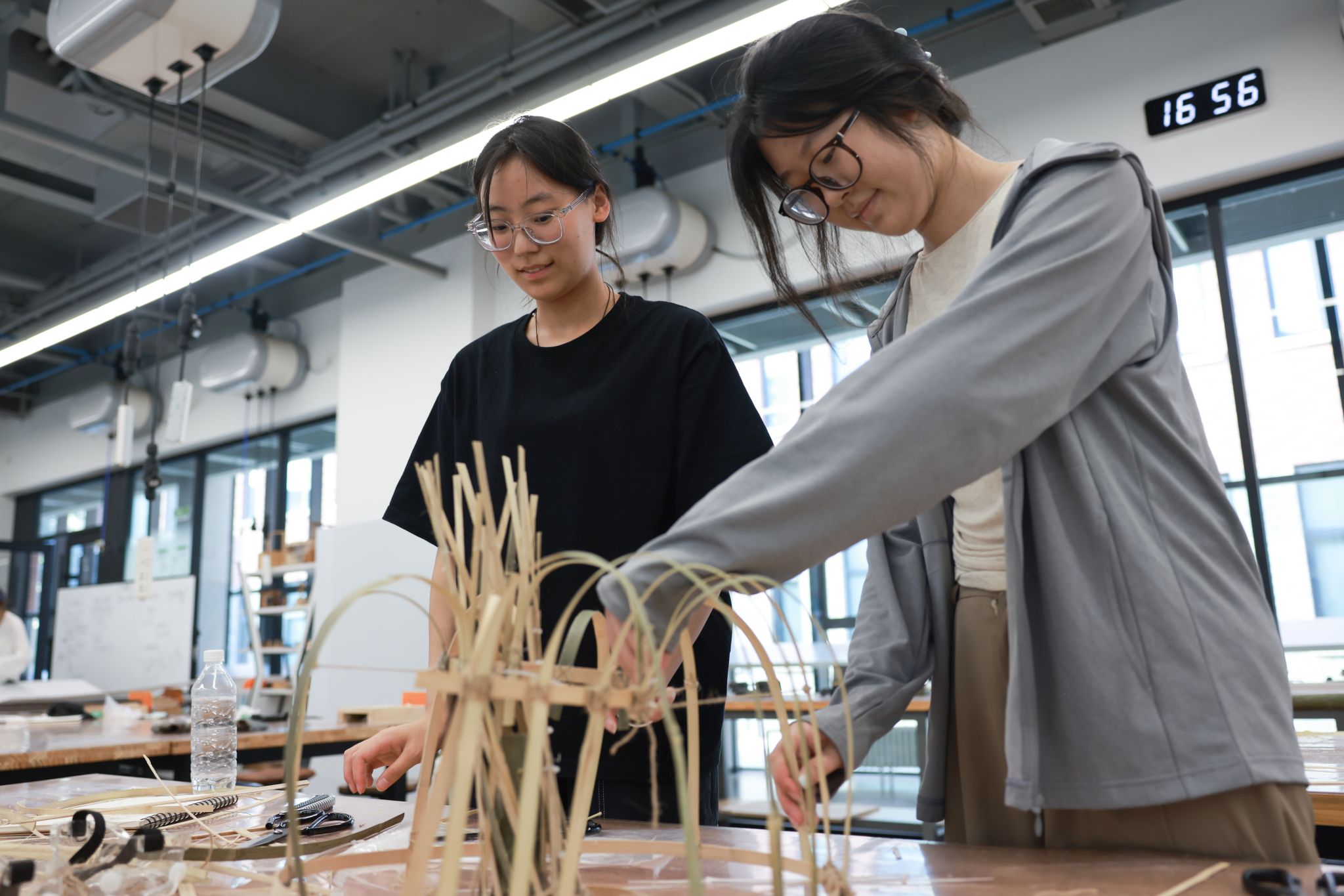 学生根据图纸制作1:5小模型,感受软性竹条和硬性PP版的材料特性。以此,学生直观地感受到材料的质感和性能,理解不同材料之间如何相互作用和结合,并验证自己的想法是否合理和可行。