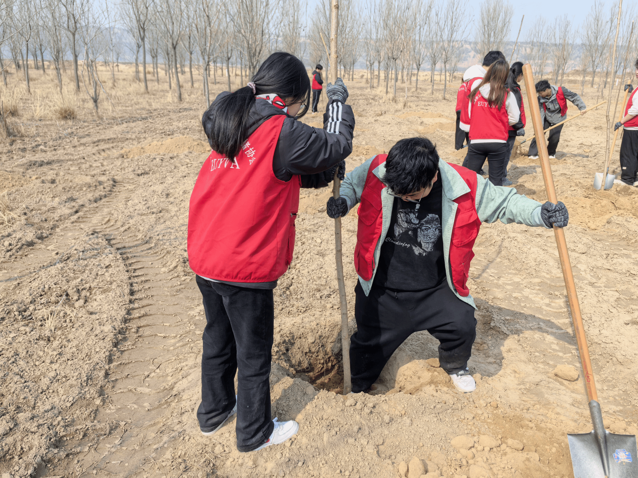 活动现场,林业技术人员全程指导,从树坑深度到土壤回填细节,志愿者们认真学习,将环保理念融入实践。欧亚学子以小组形式配合,有的负责扶正树苗,有的填土夯实,团队协作间展现出的高效与默契,成为春日里最动人的风景。活动共栽种杨树、侧柏等苗木千余株,为澽水河畔增添了一片生机勃勃的“青年林”。