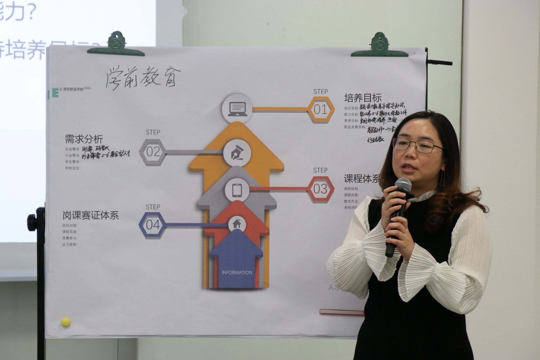 邓博老师以新闻学专业为范例,现场拆解“需求分析→培养目标→课程体系→岗课赛设计”全流程,实现“行业标准进课堂、企业项目进课程”。通过行业标准导入、岗位能力拆解、课程模块重构、评价体系设计实现专业升级。