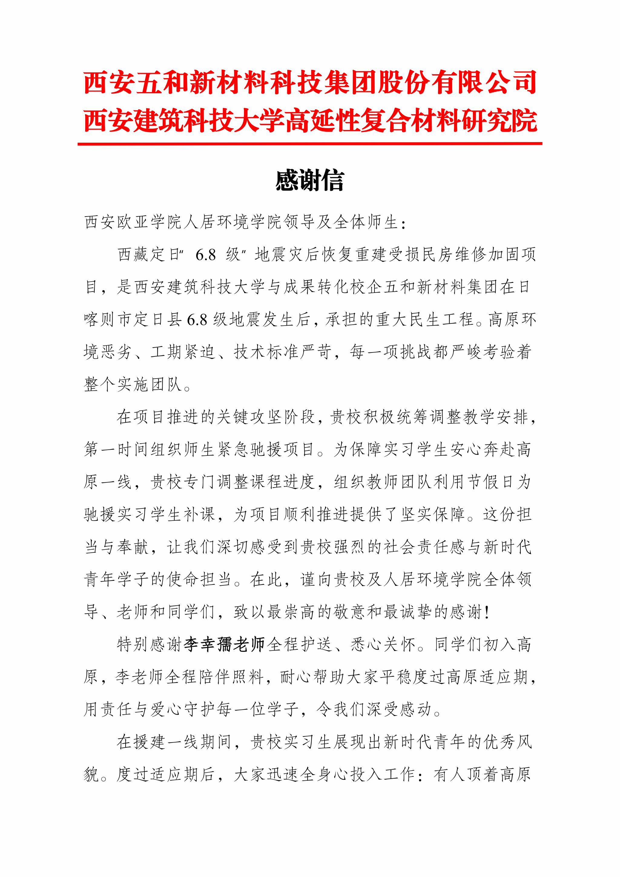 近日,学院收到西安五和新材料科技集团股份有限公司、西安建筑科技大学高延性复合材料研究院授予的牌匾与感谢信,对学院师生在西藏定日“6・8”级地震灾后民房维修加固项目中的突出表现给予高度评价,这既是对项目成果的认可,更是对学院实践育人模式的肯定。