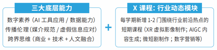在“以学生为中心”的课程体系中,分院构建了“3+X”模块化课程——三大底层能力(数字素养、传播伦理、跨界思维)夯实根基,X课程紧跟行业前沿(如AIGC内容生成、微短剧制作等)。这让薛颖既扎实掌握了新闻学的核心能力,又早早拥抱了AI技术变革。