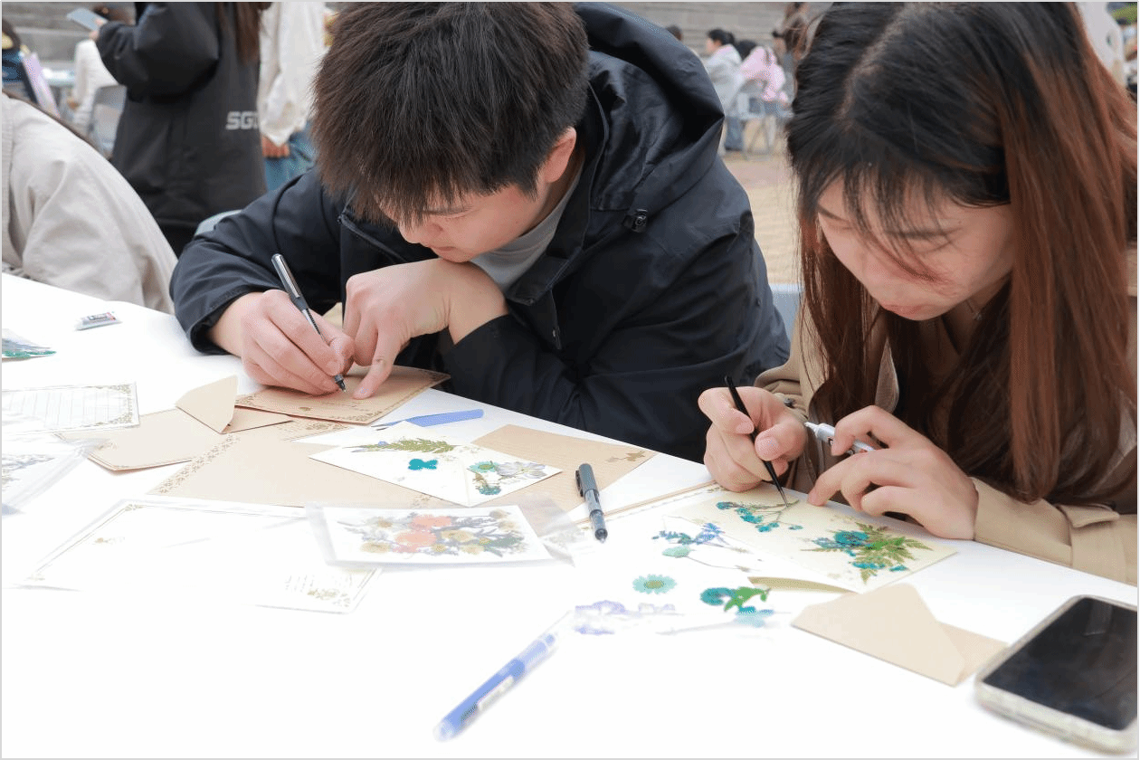 在“拼豆艺术疗愈”体验区,学生们沉浸于拼豆创作,通过色彩与造型的搭配舒缓情绪、释放压力。“赫兹情绪调频——Color Walk幸福感提升体验”引导参与者抽取颜色、裁剪拼贴,在“光与色的拼贴诗”中激活积极情绪。“墨染心韵”传统文化心理育人活动则将书法创作与心理觉察相结合,帮助学生在蒙眼书写中体悟自我接纳的意义。“微笑传递——向阳成长”体验区以“情绪小怪兽”为载体,引导学生觉察情绪、抽取心理工具、制作微笑徽章,在趣味互动中实现从问题视角向资源视角的转变。“春日来信”干花书信创作让学生在动手制作与书写中安放情绪、寄托期许。“自然生长——在每一片叶子中看见自己”借助植物流麻与挂件制作,帮助学生在慢节奏中平复心情、发现内在力量。“植愈:在绿植中遇见自己”艺术疗愈体验活动以植物为媒介,引导学生在种植、命名与小组分享中联结生命故事,唤醒希望感。活动同步启动了为期15天的“绿植养护×心灵关照”线上打卡,将心理育人从现场延伸至日常。