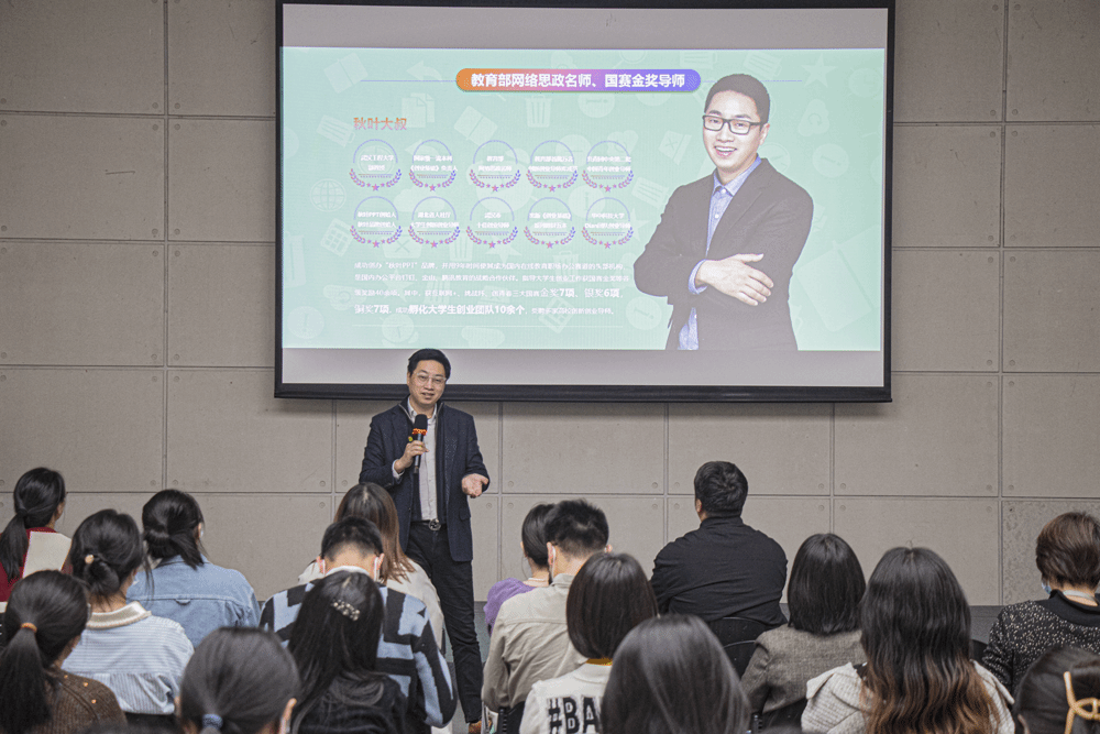 培训开始,秋叶老师从个人经历讲起,介绍了自己从“小镇做题家”到成为拥有千万粉丝网络教育专家的经历,以亲身经历鼓励老师们要在工作的岗位中深耕,将自己的工作做出成绩并且品牌化,打造个人影响力。秋叶老师在培训中分享了武汉工程大学辅导员王乃靖的成长案例,介绍了王老师如何将工作内容与个人学生事务品牌建设结合、从一个优秀辅导员成长为就业导师的案例,勉励在座的辅导员老师要“让自己的工作业绩做成大成果,把日常的工作串起来打造品牌”。