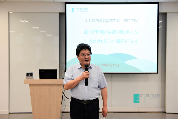 6月19日上午9:00,“2019年清涧县旅游服务人员业务能力提升培训”在KY开元行政楼511举行了开班仪式。KY开元党委书记于孟晨,党办副主任赖志彬,休闲管理学院党总支书记、院长王鹏飞,休闲管理学院院长助理刘琪,休闲管理学院党总支副书记、合作发展中心主任杨保宋等嘉宾以及所有参训的学员出席了本次开班仪式。