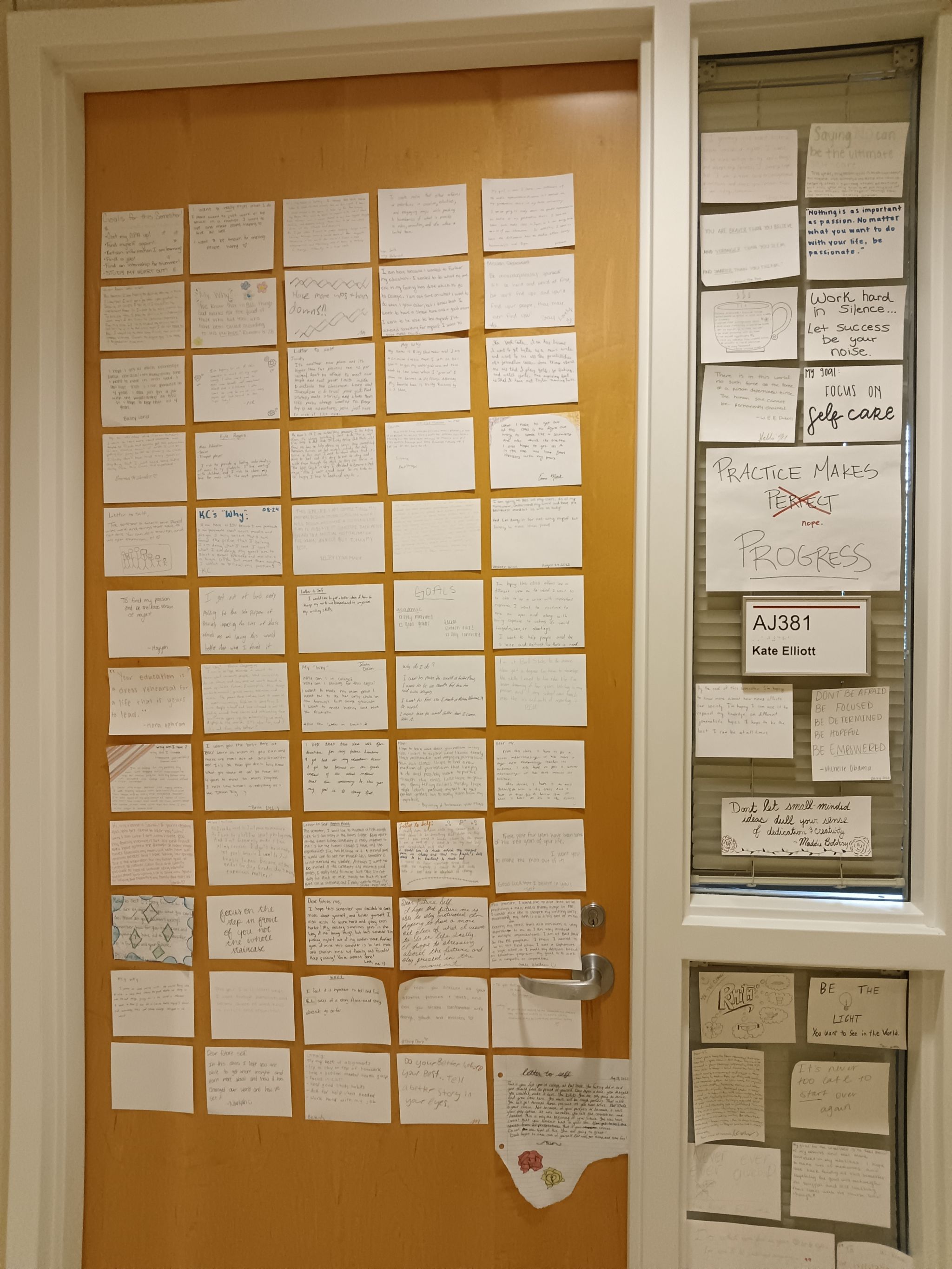 另外,口头和书面反馈、个性化反馈、定期评估和问卷调查以及学生成果展示都是很好的一些教学反馈方式。这里也有一个让我震撼的地方,就是在鲍尔州立大学看到了一位老师的办公室门上,贴满了学生对他以及对他的课程的评价、困惑,也有最想说的话。随行的鲍尔州立大学老师说,贴满便利贴门里面的老师是非常好的老师,备受学生的喜爱。这何尝不是一种有温度的反馈呢!