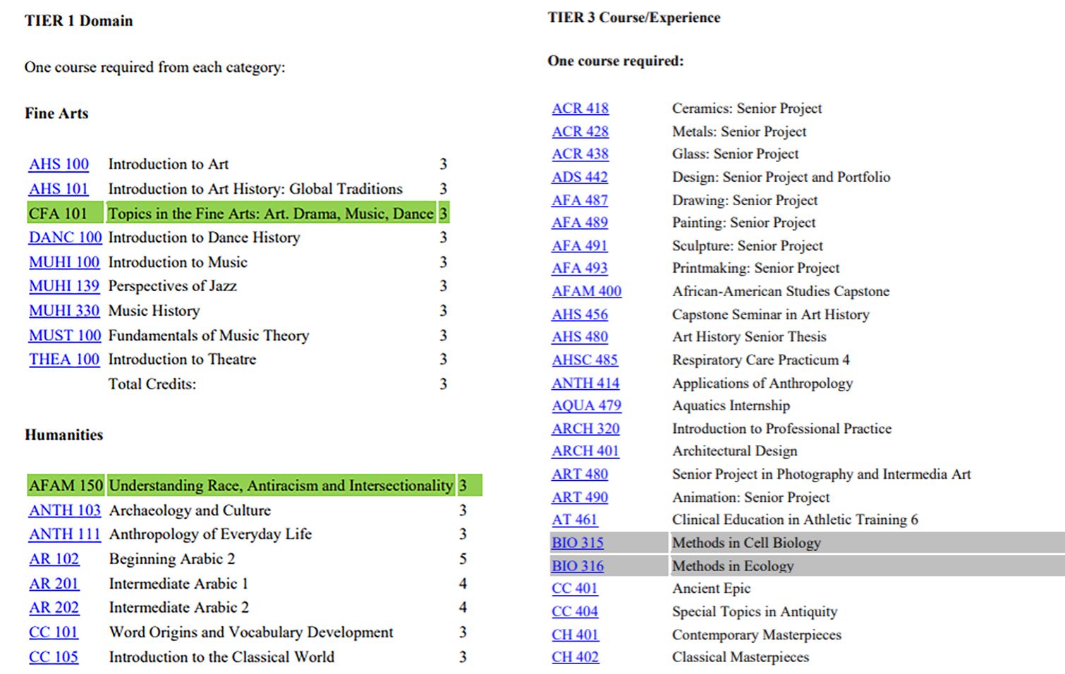 ①智力发展:正如序言和目标与目的中所指出的,UCC课程必须有智力发展目标,而不仅仅是内容方面的要求。②接触多个领域:UCC确保学生能够根据其特定的认识论和方法以及内容区分知识领域。③21世纪技能的整合:除了培养英语写作必修课程之外的写作技能外,UCC还要求学生参与公民生活,关注多元文化和环境相关的问题,不是在每个领域的单独课程中,而是在专业内外。UCC内部或外部的课程中解决一个或多个领域的问题。④ 核心课程与专业相结合:UCC允许本专业课程最多占核心课程6个学分,前提是本专业课程符合学习转型要求。⑤体验式/沉浸式体验或类似的学习体验:UCC希望学生通过积累和整合的体验,包括个人或合作的反思部分,并提供口头和书面交流的机会,以达到大学毕业生的水平,展示在专业(以及相关领域,视情况而定)成功工作的能力。⑥学习成果:UCC鼓励大学任何部门的参与,因为核心课程的可接受性取决于学习成果和课程内容。