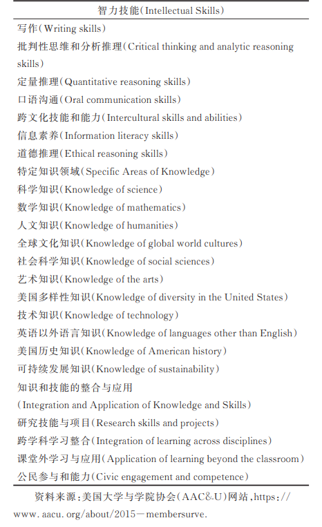 美国哈特研究组(Hart Research)进行的多项调查显示:2006年AAC&U近80%的成员院校均为所有本科生提供了一套通用的预期学习成果,这些成果涉及多种技能和知识领域,遍布于高校全部或特定院系之中。其中技能包括:书面表达、批判性思维、定量推理和口语表达。知识领域包括:人文学科、科学、社会科学、全球文化和数学。随后2009年在知识领域又增加了5个:美国的多样性、技术、美国历史、语言、可持续性;技能方面增加了7个:跨文化交际能力、信息素养、道德推理、 公民参与、学习的应用(应用程序的学习)、研究技能、综合学习。参与机构还通过学校(校园网站,教师指导,项目培训,学生指导系统)、院系(院系目录,课程大纲)、个人(观点书,一年级研讨会)三种渠道对学生预期学习目标进行解释、声明和传达,以扩大学生对通识教育学习成果的理解。