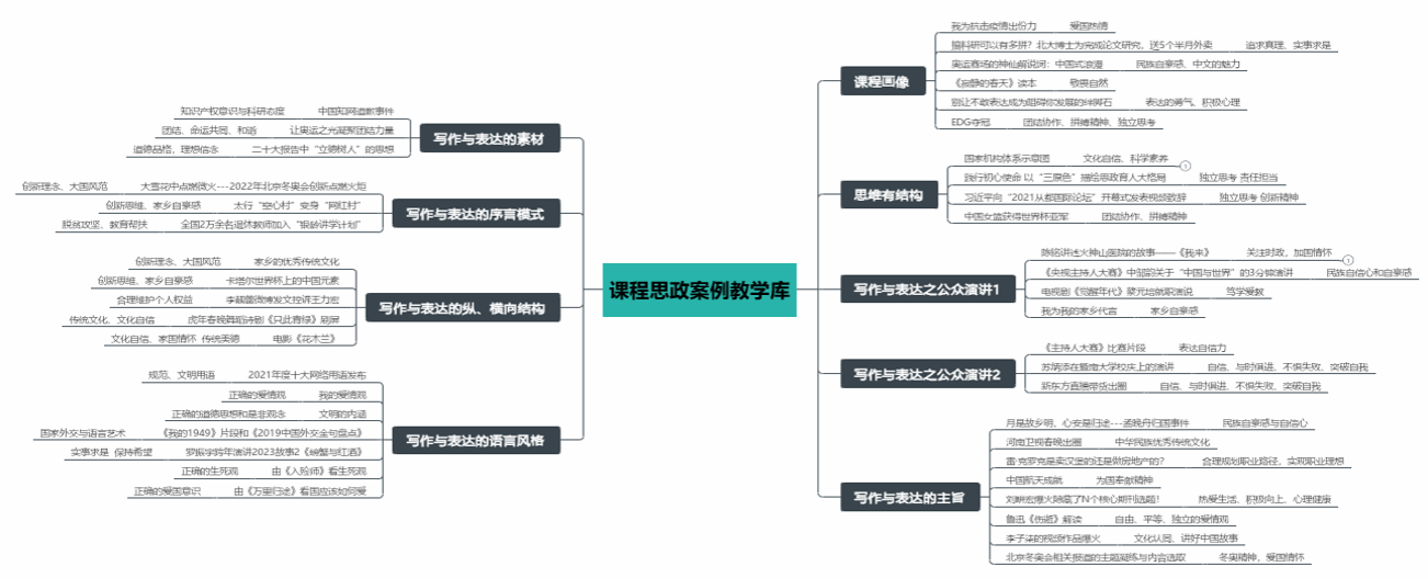 ③ 教学案例及其他资源库建设:建立了系统课程思政教学案例库、课前演讲主题库、85种阅读材料库(含视频材料)。课程思政教学案例服务于教师教学,挖掘人文学科思政元素,提升课程思政育人功能;课前演讲主题库服务于学生公众演讲,提高表达自信力,85种阅读材料服务于课中深度探究及课后阅读参考。