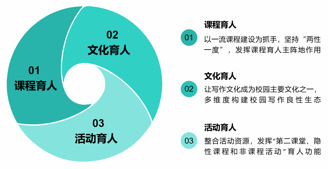 营造校园写作文化,形成文化育人模式。构建了以课堂教学为本,以第二课堂为辅;教师为引领,学生为主体;课程建设与学习支持双管齐下;实行四年制全过程写作,发挥校园写作文化引领作用的全方位立体化模式,让学生在本科学习期间,浸润在课程育人、文化育人和活动育人的环境中。
