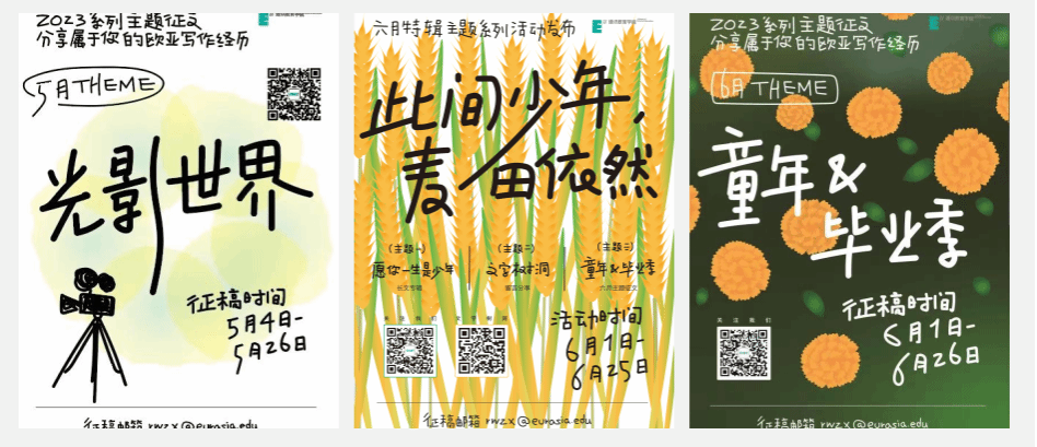 课程组自建的数字化写作实践平台“Eurasia写作与表达”公众号,以主题化、系列化的方式引导学生写作,精选学生和教师优秀作品发布。自2023年3月创办以来,先后设置了“三月:春日来信”“四月:阅读给你答案”“以书之名,四月与你”“五月:光影世界”“六月:此间少年—麦田依然”“童年与毕业季”“七月:城市与旅行”系列征文写作活动。参与写作师生200余人,产生一批优质作品。此平台将持续深耕下去,为构建欧亚写作生态圈发挥中坚作用。