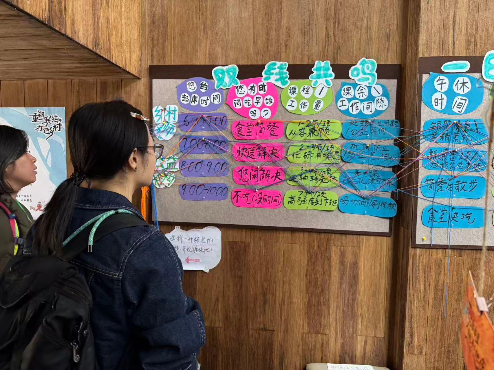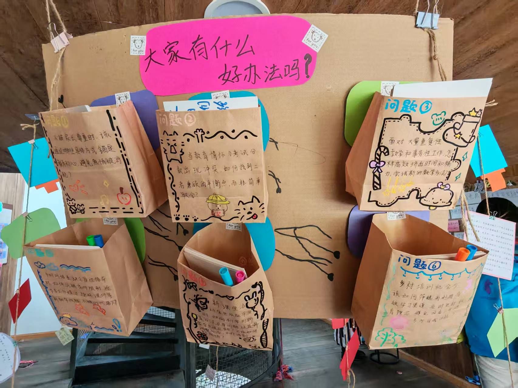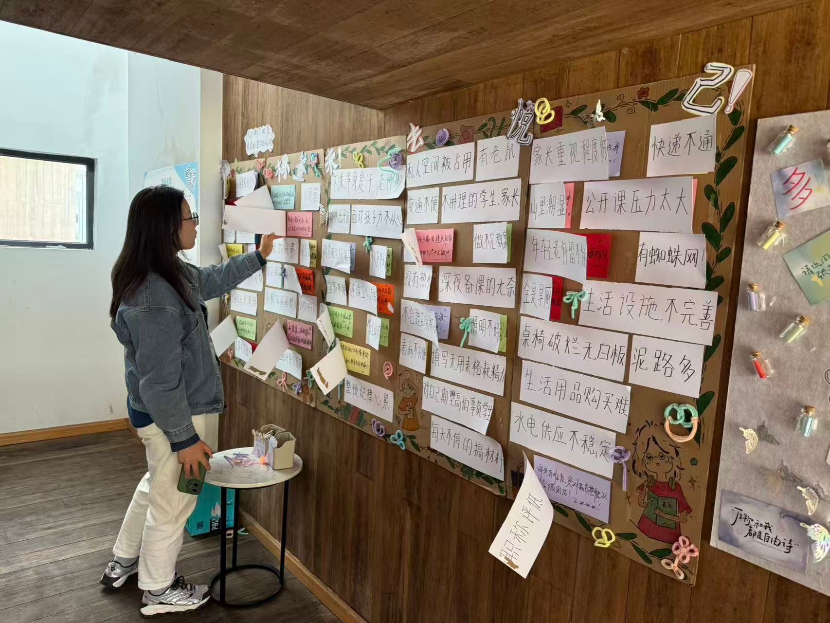 此后,这一聚焦于个体生命状态的议题,进一步发展为学院《教育学基础》课程的核心成果,刘念策划并落地了“歇会儿,喘口气”展览,并受邀参与“第二届乡村儿童美育公益行动论坛”,师生们共同创作的作品被邮寄至论坛并成功布展。整个展览包含多个分主题,其中“教师能量充电站”特别关注一线教师真实处境的部分,通过详实的问卷调研,将老师们面临的行政压力、备课无奈等困境进行视觉化呈现。