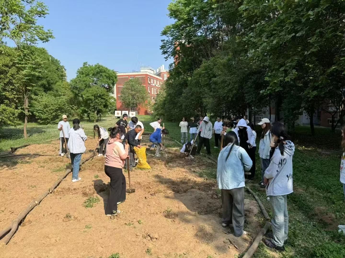 “令我印象特别深刻的是班上有几名男生特别喜欢自己的菜园,他们组成‘开垦小队’,想要种植红薯等根茎类植物,需要挖大坑。但是后来发现这块土地十分匮乏,需要进行培育养护。北E楼前高大的松树下因长期掉落松果与松针,积攒了一层厚厚的草木灰,他们将草木灰逐箱挖掘并与土地混合,给予土地肥沃的养料。”刘念第一次感受到学生们对土地的用心管理与热爱。