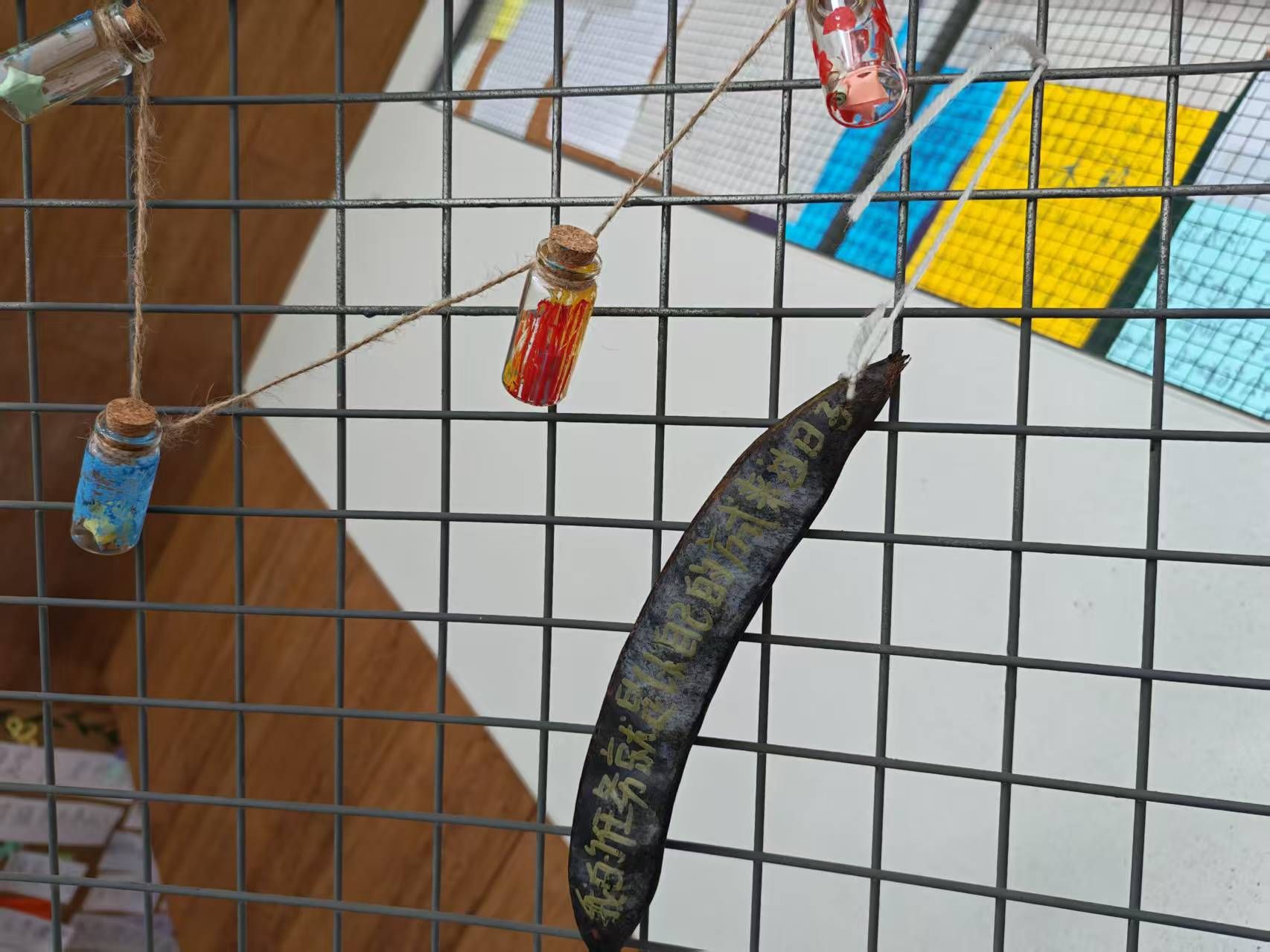 展览中的另一大亮点“来自欧亚的能量皂角”分展部分,其灵感源于一个温情故事:学校后勤叔叔信守一年前的承诺,特意为刘念收集皂角。师生们将这些承载着诚信与关怀的皂角,书写教育格言后悬挂于展厅,成为了一个传递能量、触动人心的独特艺术装置,生动体现了从乡土实践到人文关怀的延伸与教育理念的融合。