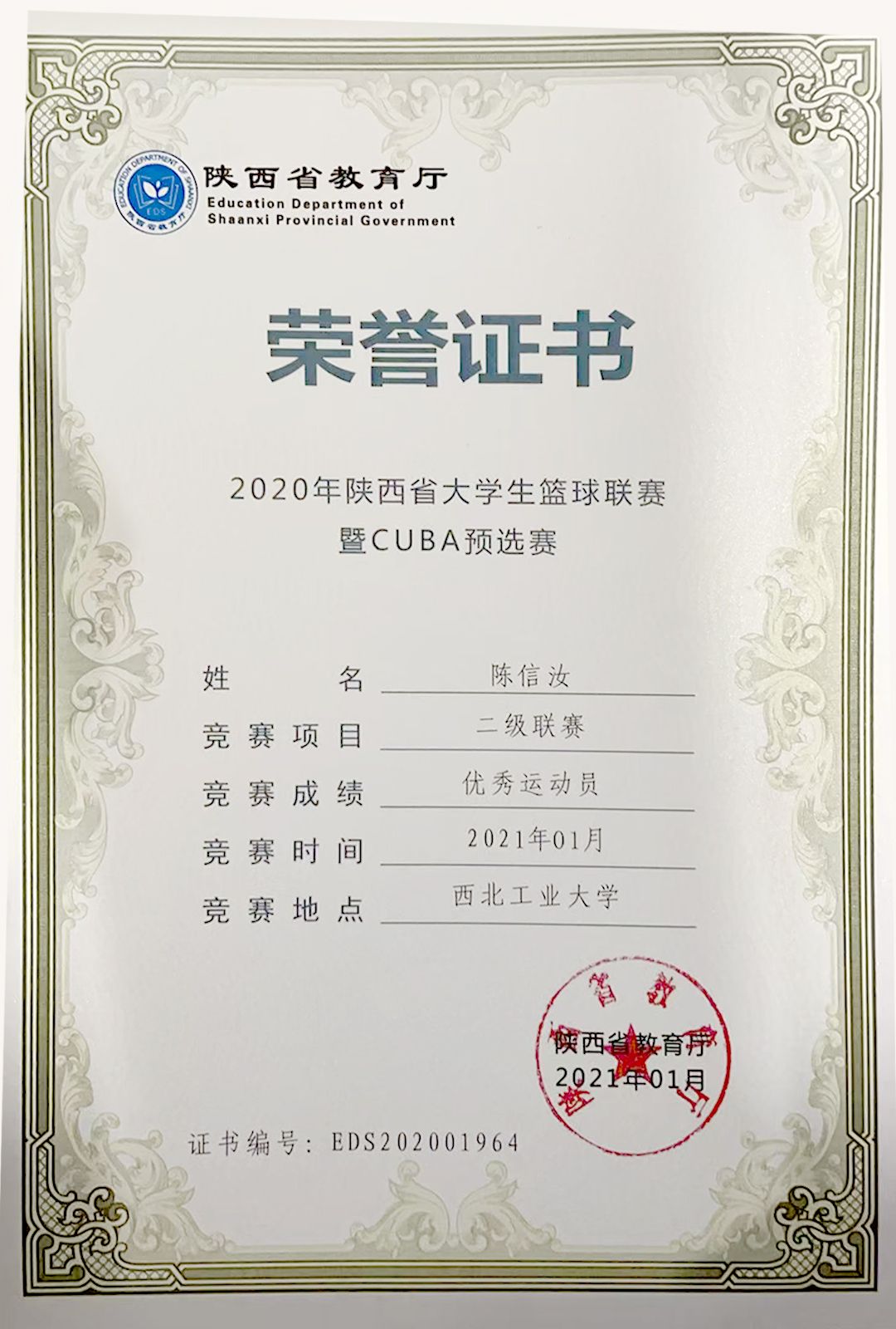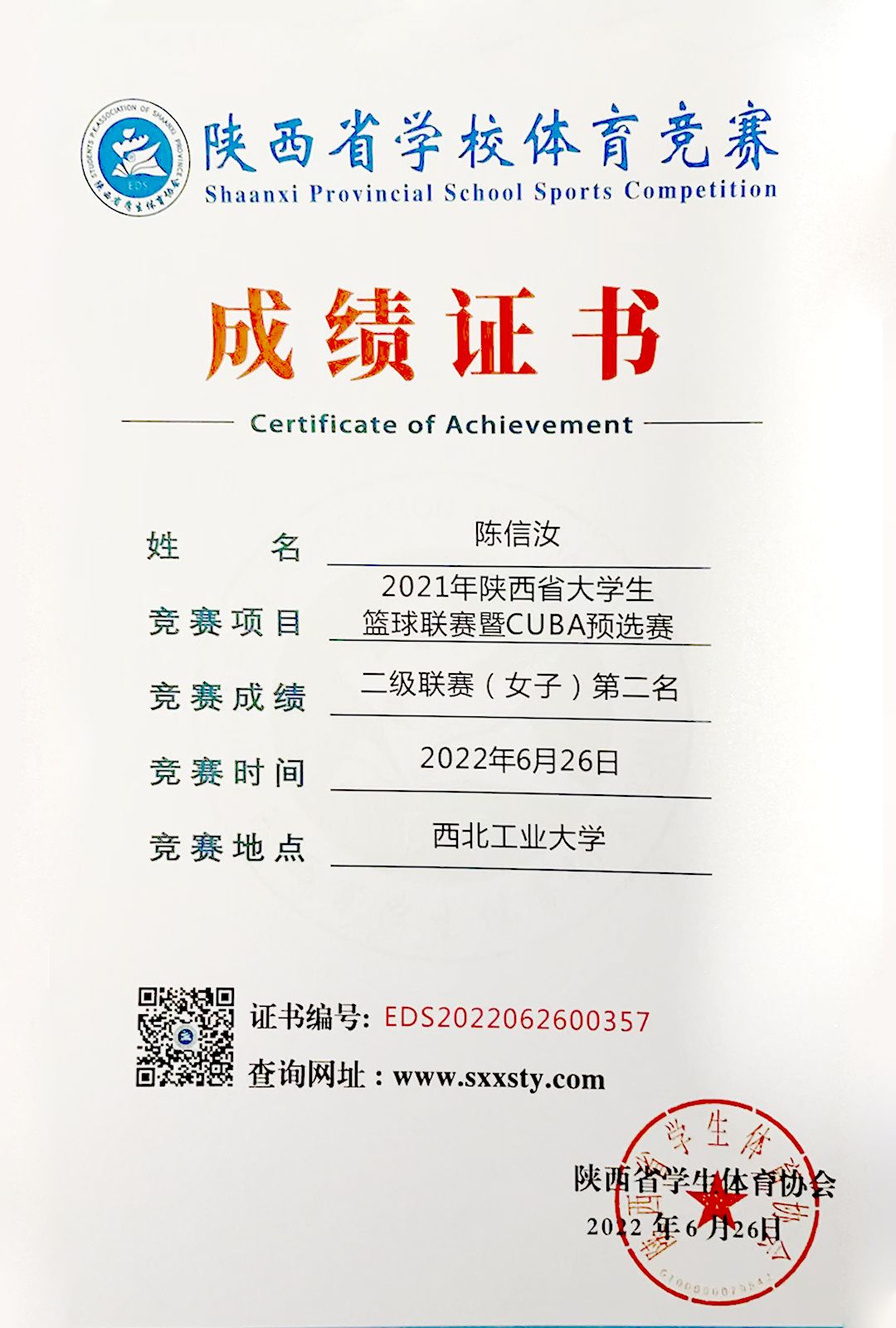 当年,陈信汝和队友们奋力拼搏,最终拿到了第三名的好成绩,担当后卫的陈信汝成为球队的头号得分手。2022年6月,欧亚女篮整体实力更进一步,陈信汝所在的团队又捧获了2021年陕西省大学生篮球联赛暨CUBAL预选赛二级联赛的亚军。