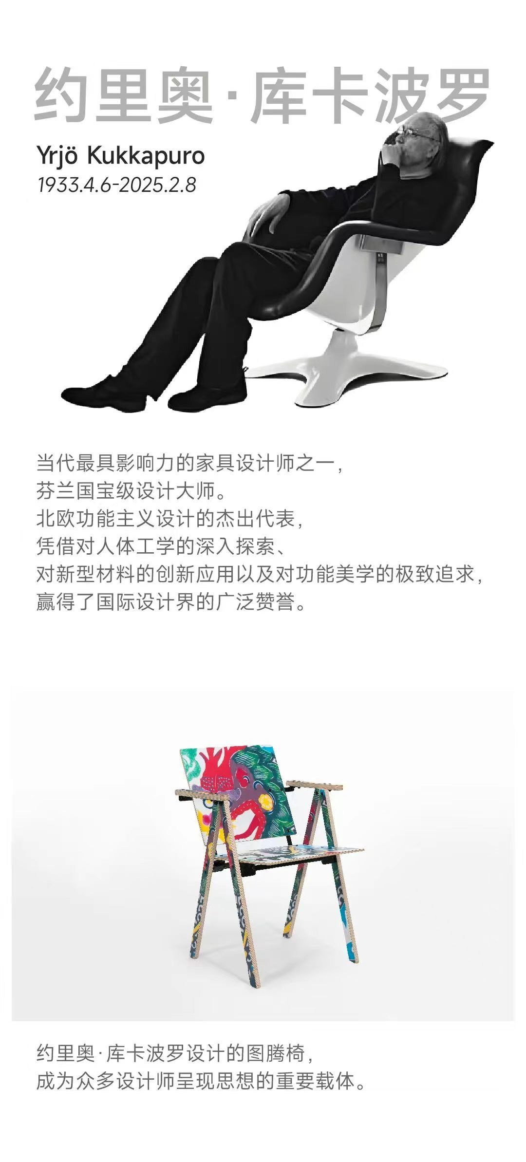 芬兰大师约里奥·库卡波罗(Yrjö Kukkapuro)是现代主义设计的坚定实践者,他的作品不仅是物件,更是设计哲学与人文关怀的载体,其设计核心在于革命性地将人体工学引入家具设计。他曾说过:“椅子应该是人体形状的反映。”在长达近七十年的创作生涯中,他不断推敲椅子的结构与比例,致力于让“坐”这件事变得更合理、更柔和、更体贴。
