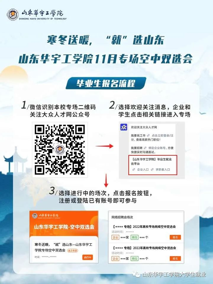 微信报名入口:手机微信扫码关注“大众人才网”微信公众号,企业和毕业生分别点击相关按钮进入山东华宇工学院校招端口,点击报名按钮,注册或登录已有账号即可直接参与。